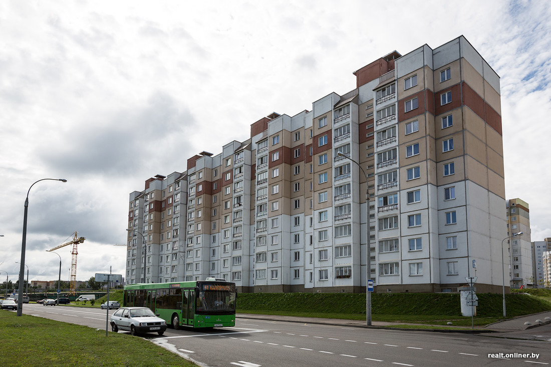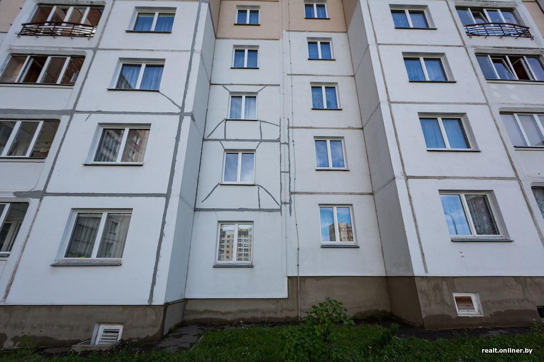 Квартира расположена в доме №18 по улице Чичурина в Домбровке (новый жилой район между Масюковщиной и Каменной Горкой). Это ничем не примечательная панелька, коих в Минске сотни. Дом сдавался в конце 2012 года, однако внешне уже выглядит слегка «уставшим». Старят фасад ярко выраженные межпанельные швы и замазанные трещины.