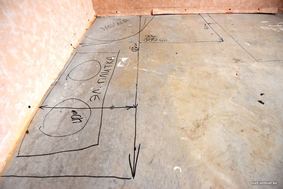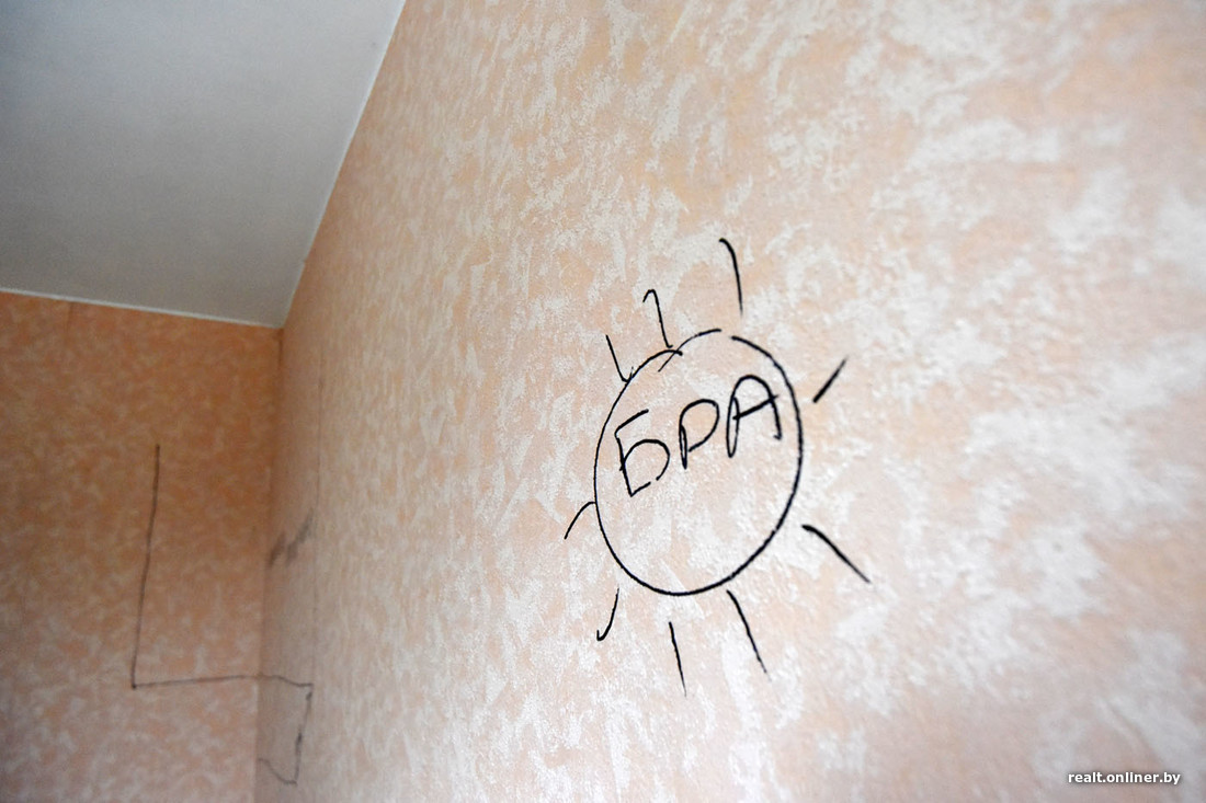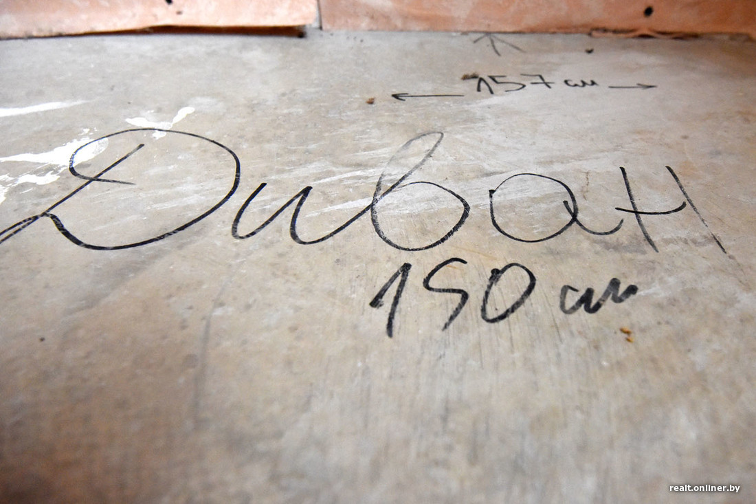 В одной из комнат на стенах и полу нарисованы проекции дивана и прочей мебели: потенциальные покупатели уже примерялись к планировке. По словам Семуткина, это еще более дешевый вариант: квартира без начинки и ремонта стоит $4500.