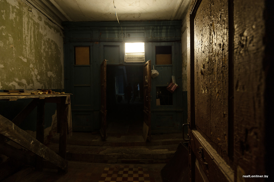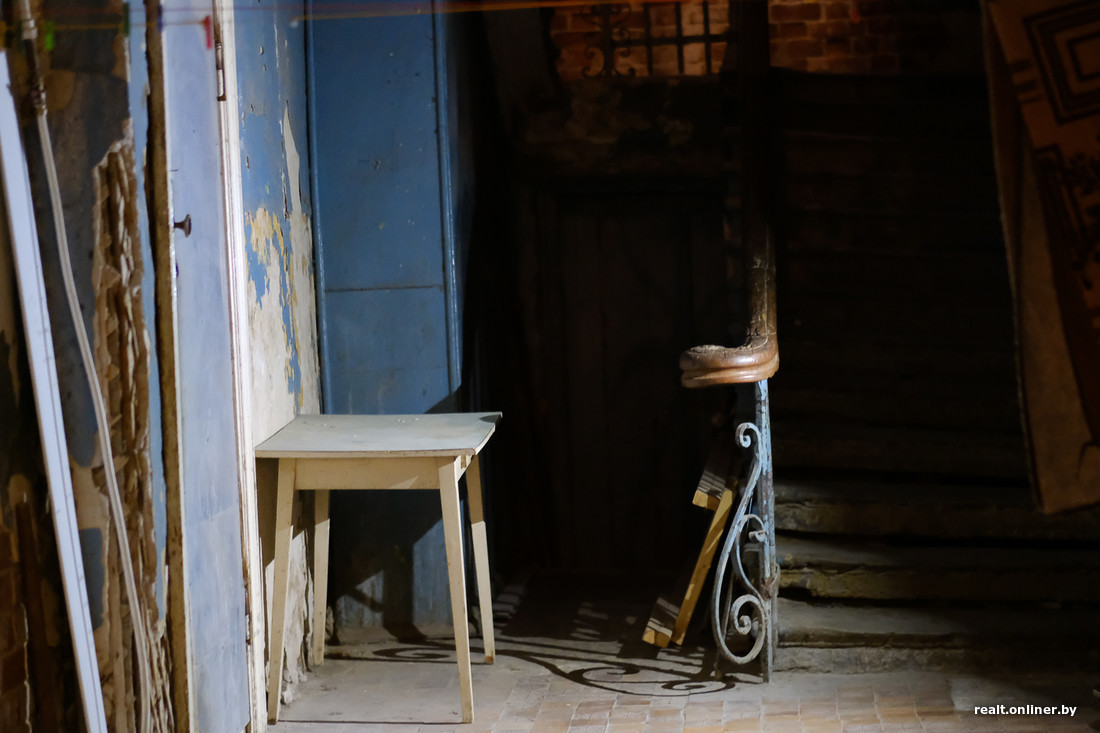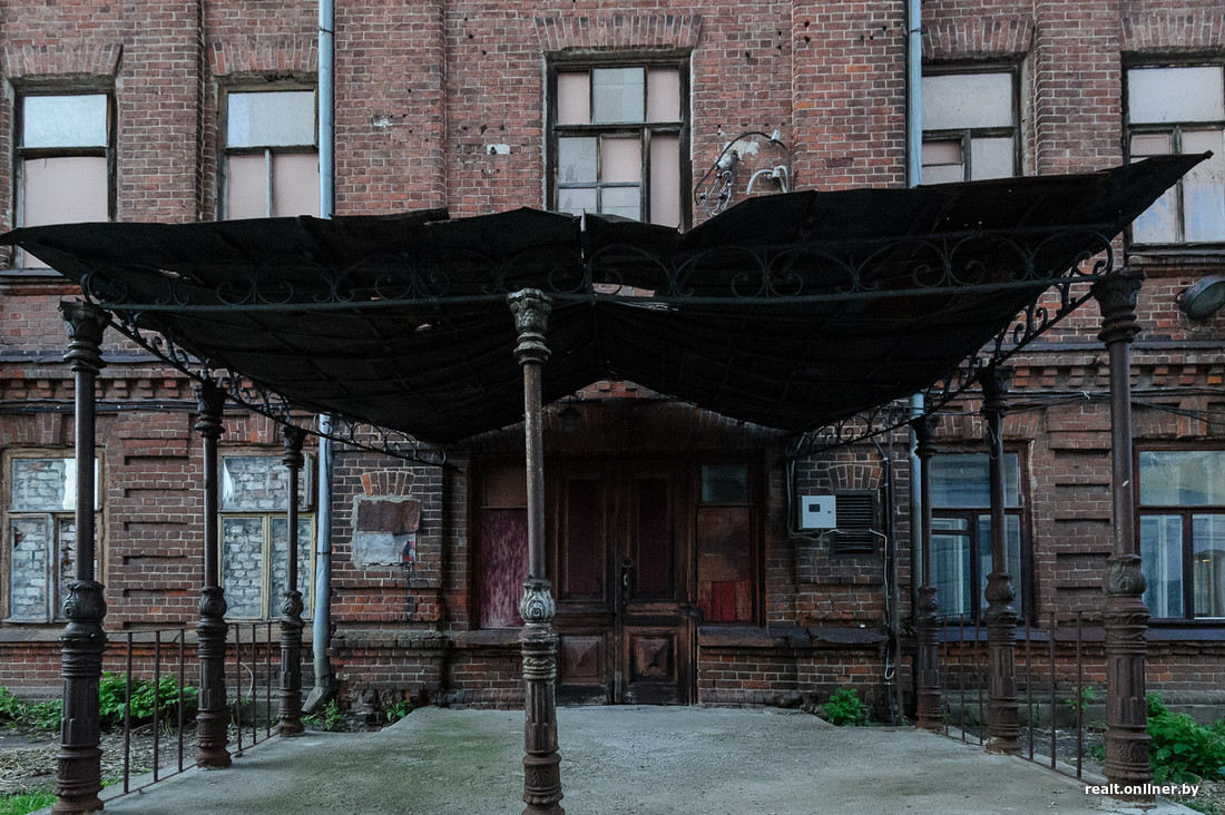 Проскользнув через сквозную парадную, где чудом сохранились витые перила и изразцовая плитка, можно натолкнуться на старинное заброшенное здание с удивительным порталом над входом.