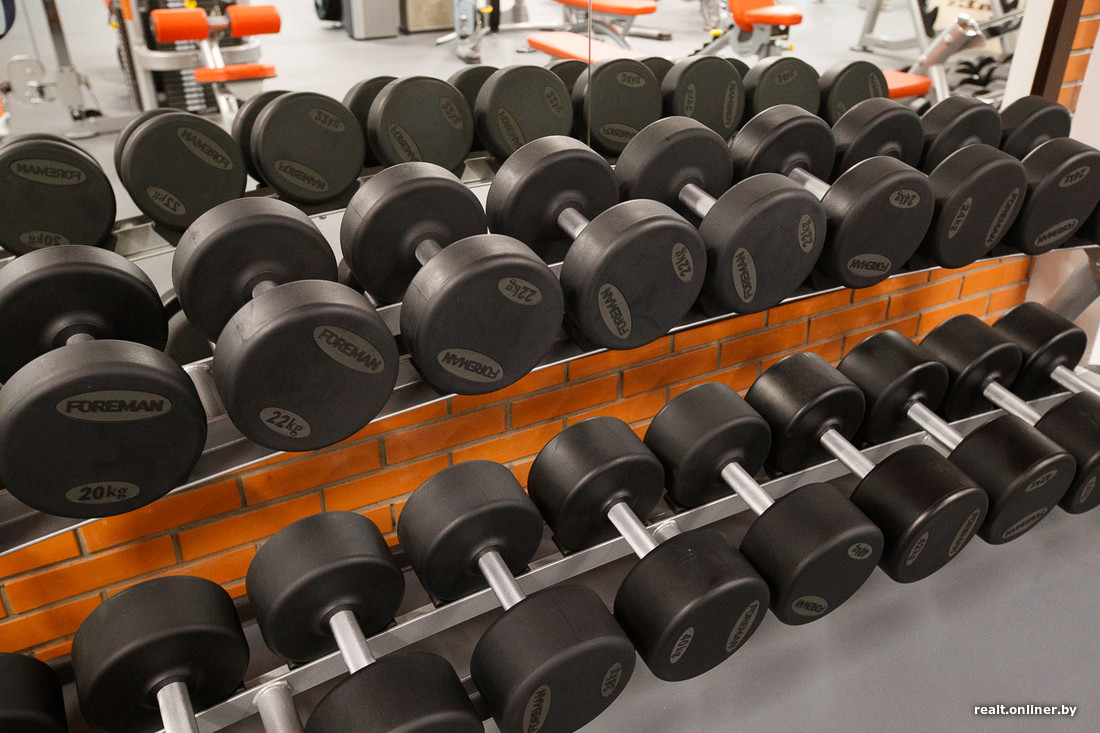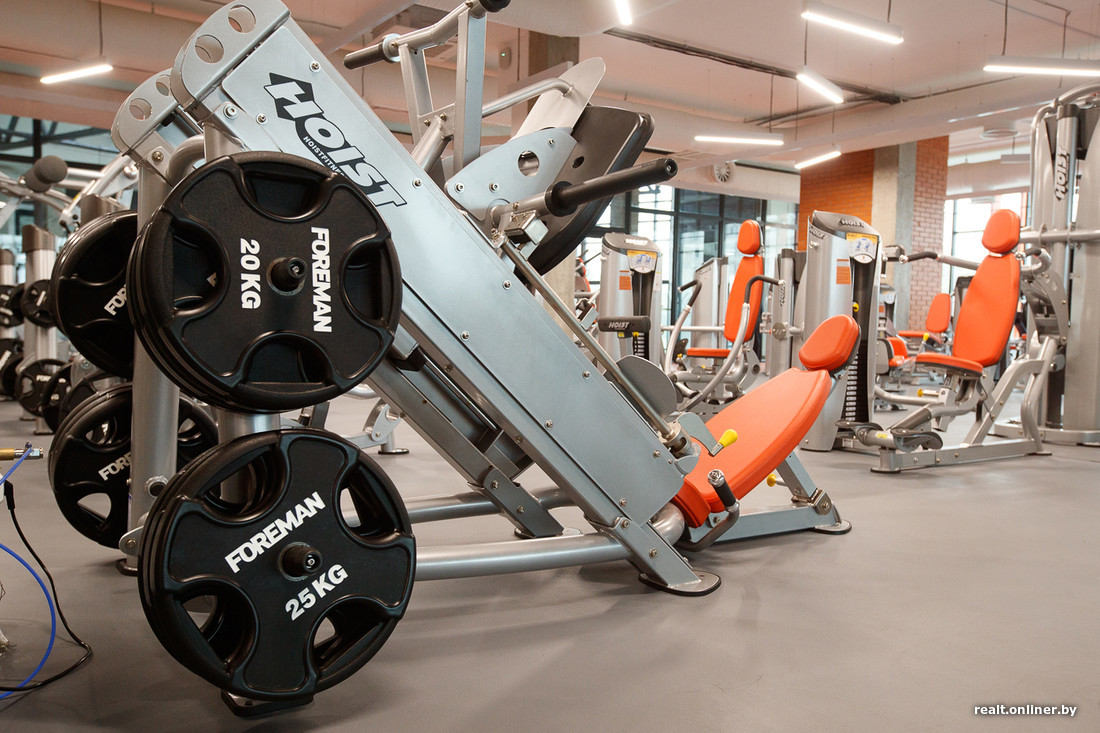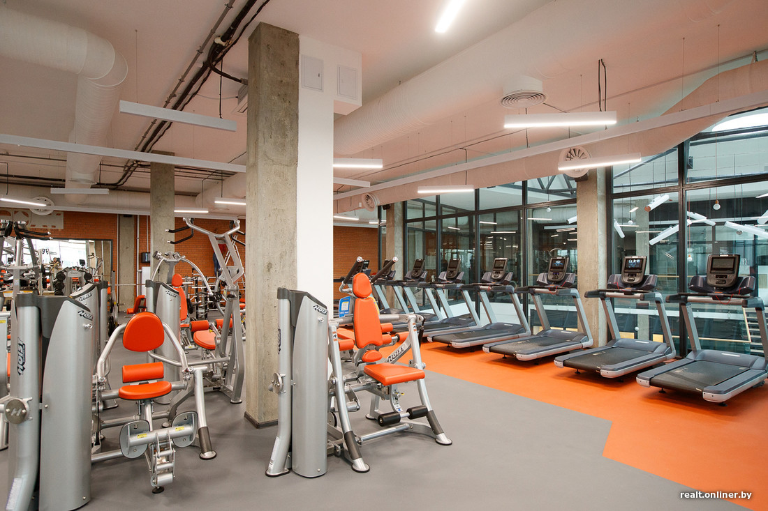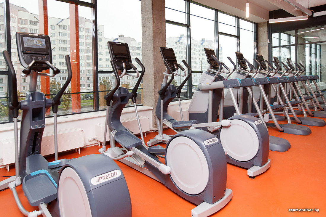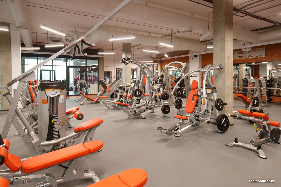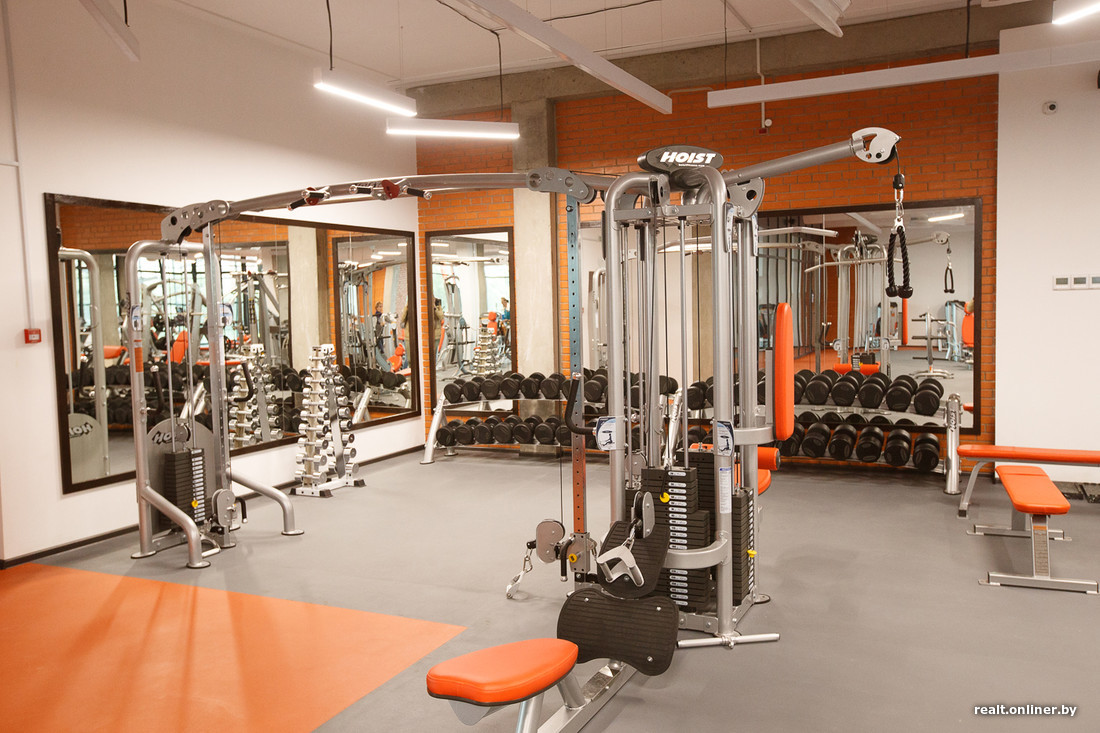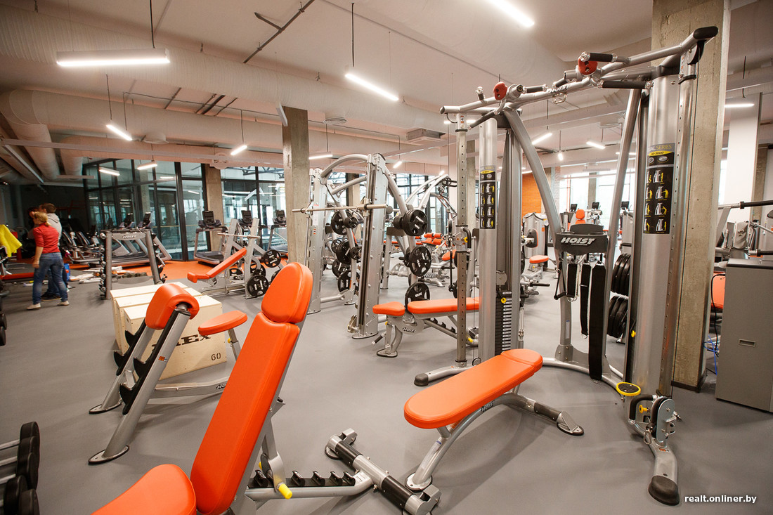 Зал площадью 452 кв. м расположен на втором этаже. Стен в привычном понимании этого слова здесь нет — только стеклянные перегородки. Кардио- и силовые тренажеры находятся в одном помещении, любителям кроссфита выделена своя небольшая территория в отдалении от всех.