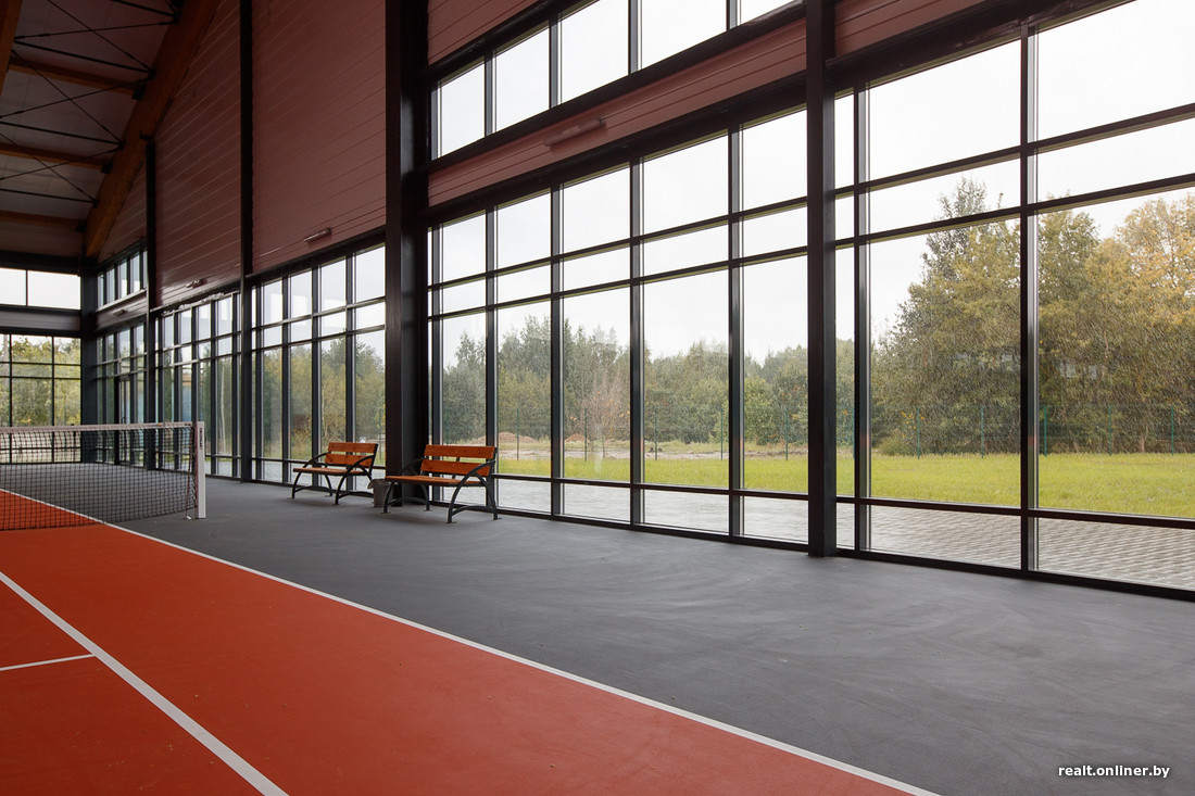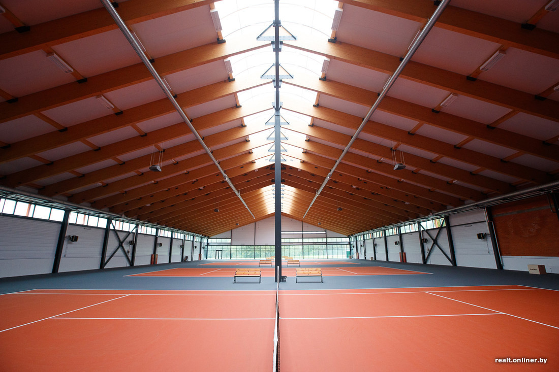 — Крытые корты занимают площадь 3000 кв. м, — продолжает презентацию Инна Юдо. — Несмотря на такие масштабы, помещение выглядит уютным. Чтобы добиться такого ощущения, мы специально не маскировали лицевой кирпич, из которого возводили стены (только покрыли его лаком), и использовали в отделке деревянные балки длиной 12,5 м. Это действительно дерево, а не его имитация — цельноклееный сосновый брус везли из Литвы на длинномерах. Балки не только выполняют свою основную функцию, украшая при этом интерьер, но и создают дополнительный акустический комфорт, поглощая звук.