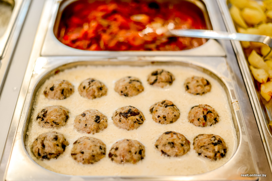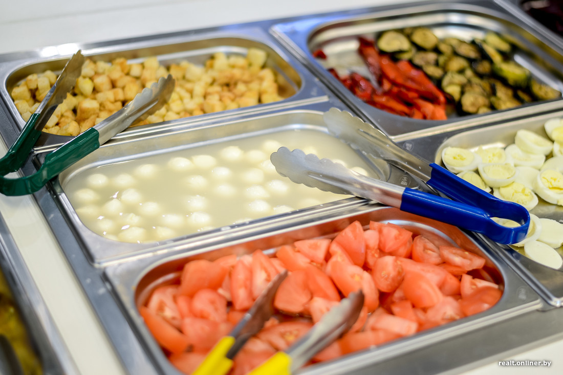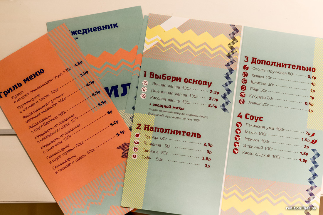 Посетители, как и в любом бистро, набирают еду на поднос и идут в кассу. В ассортименте недорогие супы, Wok-меню, работающее по принципу конструктора (от 6,5 до 8 рублей), гриль-меню, пиццы, домашняя кухня в виде горячего и холодного салат-бара (100 граммов горячих блюд — 2,6 рубля, холодных — 2,1 рубля), свежий хлеб, десерты и напитки собственного производства, а также алкоголь. Есть боксы с салатами и снэками навынос. Обед можно самостоятельно подогреть в микроволновках.