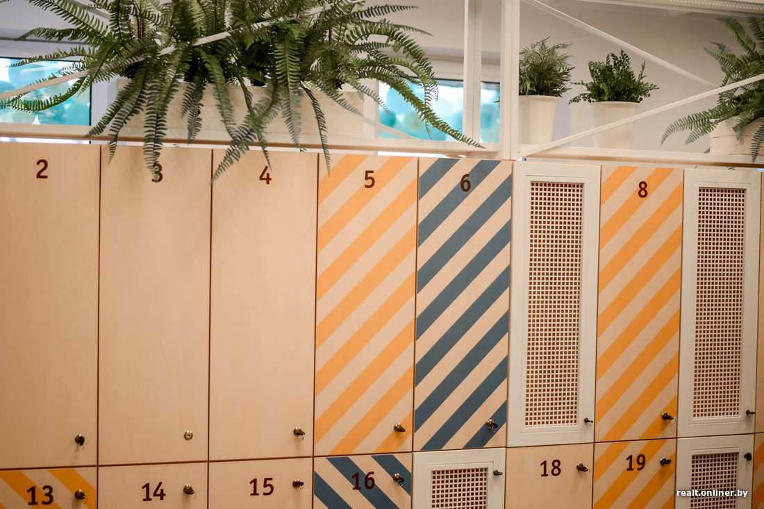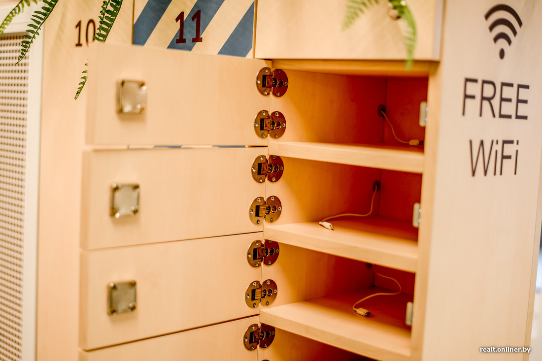 Кроме эстетики, дизайнеры продумали и функциональные моменты: есть камеры хранения, боксы для зарядки телефонов, светящиеся указатели, места для сумок под столами барного типа.
