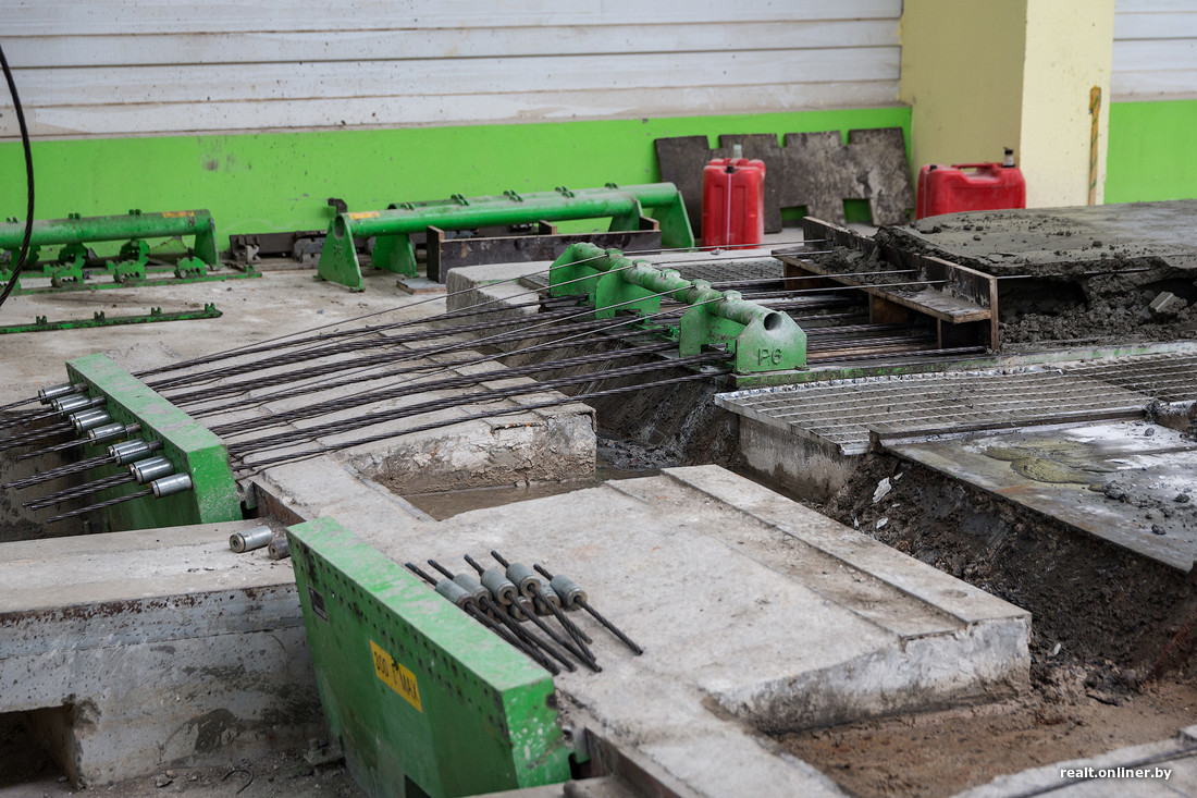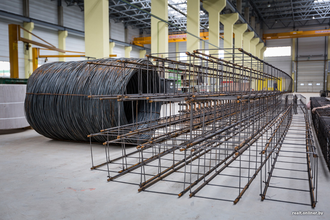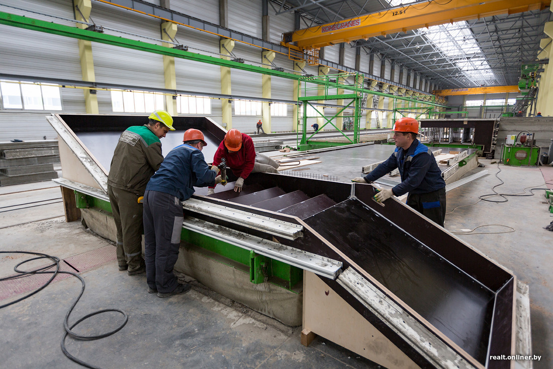 Вкратце процесс производства стен выглядит так: при помощи опалубки задаются габариты панели в соответствии с проектом, вяжется арматурный каркас, заливается первый слой бетона, укладывается утеплитель, затем — второй слой бетона. Функцию уплотнения выполняет вибростол. Далее панель поступает в сушильную камеру для набора прочности.