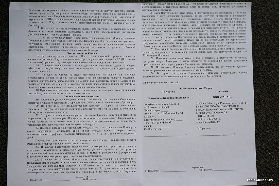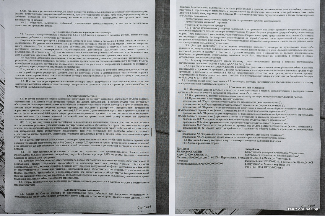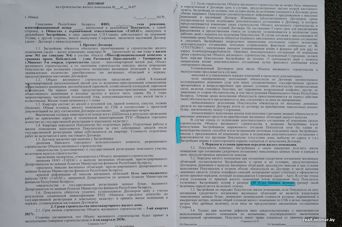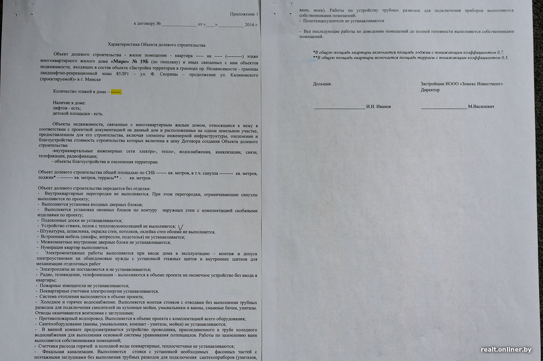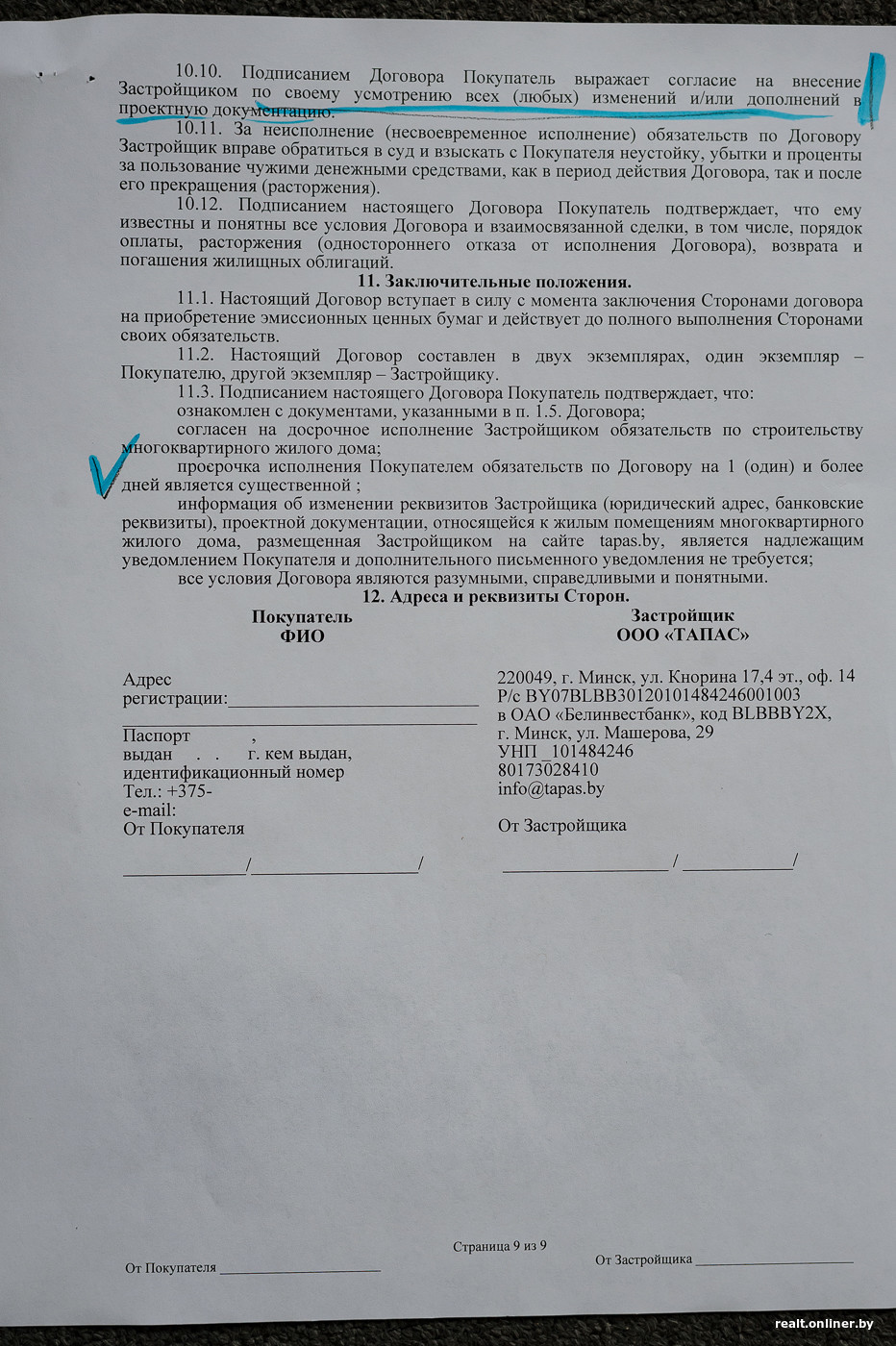 Onliner.by продолжает испытывать застройщиков, работающих на белорусском рынке, на прочность и честность. Прошлогодний эксперимент показал: далеко не все «продажники» готовы напрягаться ради клиентов, имеющих на руках всего $50 тыс. Этой осенью мы вновь отправились в поход по офисам девелоперов с важной миссией: не обращая внимания на сладкоголосое пение менеджеров про стопроцентную защищенность горожан, доверивших свои деньги их компании, мы тщательно изучили договоры, предлагаемые к подписанию. И изучив, заявляем: это не договоры, а удавки на наши, дольщиков и держателей жилищных облигаций, шеи. Подписав такие бумаги, добросовестные плательщики попадают в практически безвыходную ситуацию: им остается только переводить суммы, молчать и ждать. А еще молиться за здравие и финансовое процветание застройщика, ведь приключись с девелопером что нехорошее, вернуть, скорее всего, можно будет или ничего, или чуть-чуть больше, чем ничего.