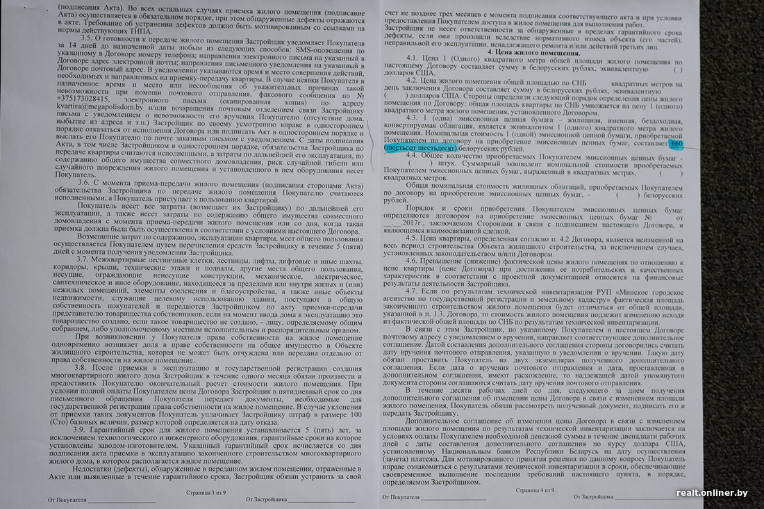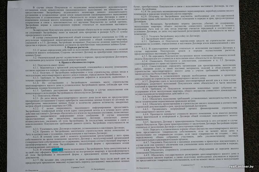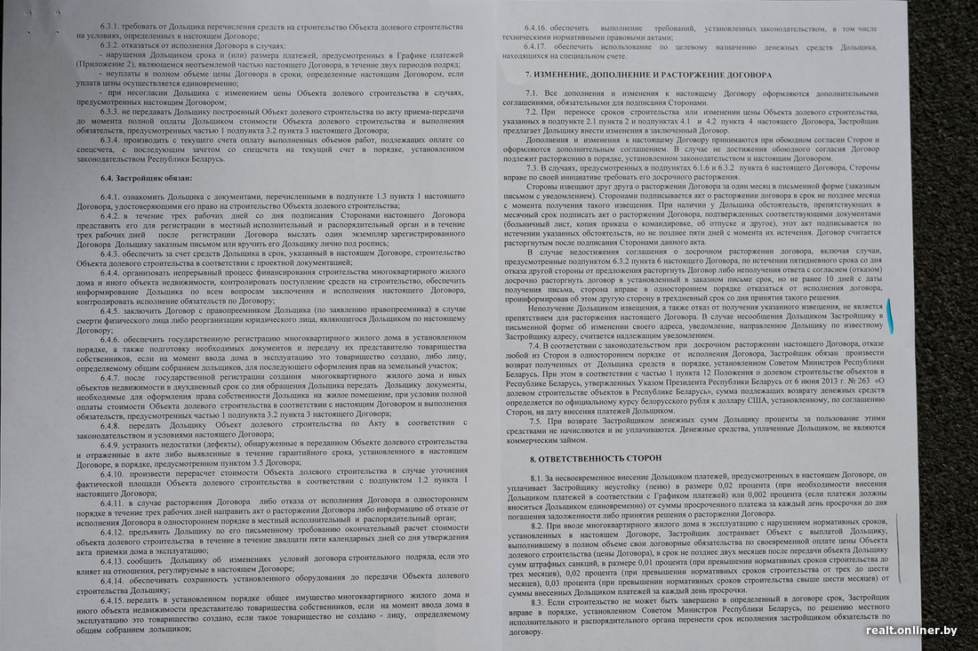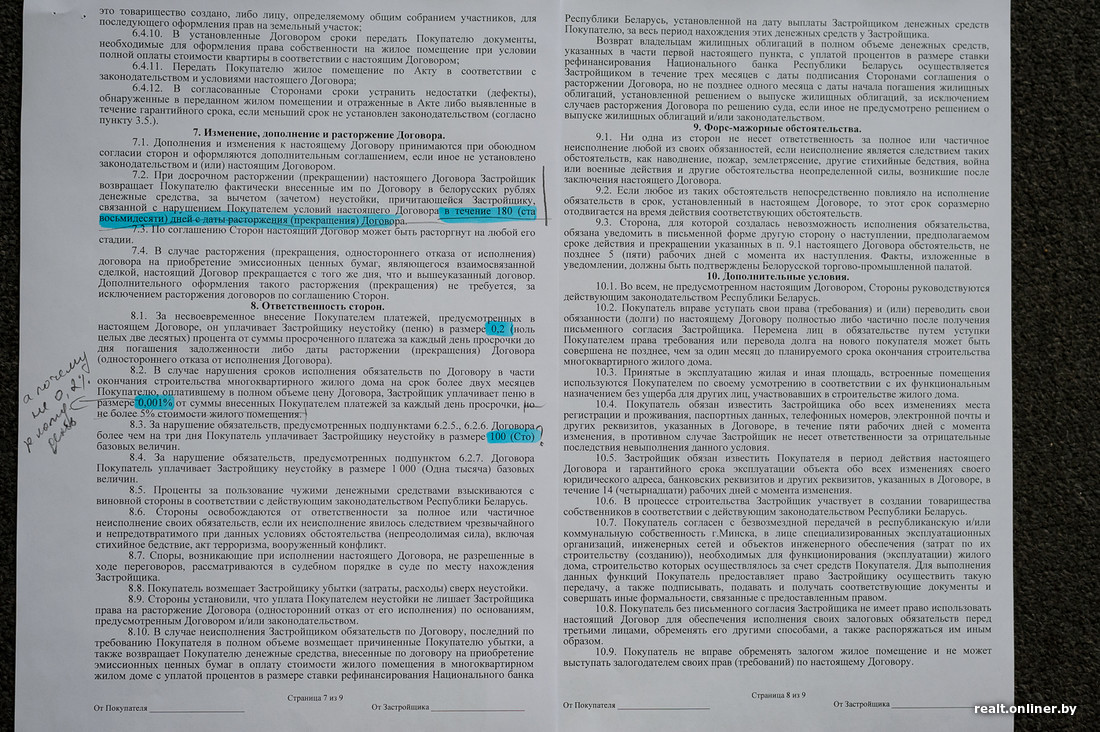 — Меня смущает пункт 7.22, в котором говорится, что при досрочном расторжении договора застройщик возвращает покупателю фактически внесенные им средства в белорусских рублях (за вычетом неустойки) в течение 180 дней с даты расторжения договора. Это же очень долго.