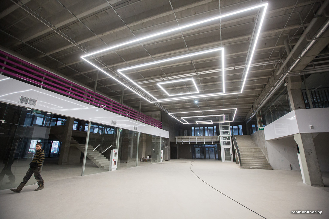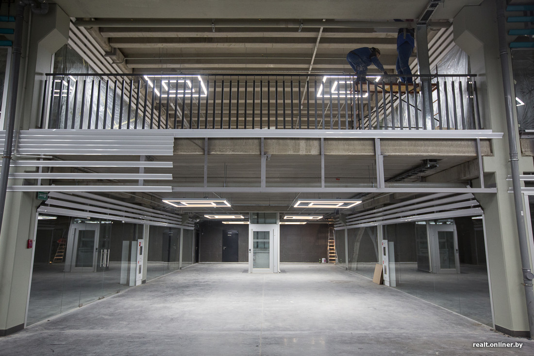 Дизайном интерьера занималась белорусская компания. По словам Александра, он получился технологичным. Этажи отличаются цветом элементов и формой светильников, но в целом они похожи. Пока все выглядит необжито, но в ближайшие три месяца здесь будут кипеть отделочные работы: арендаторы примутся за подготовку своих помещений.