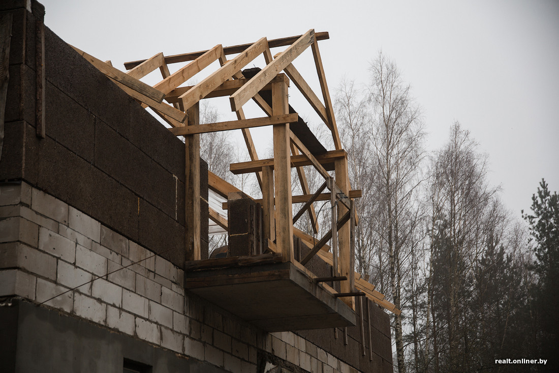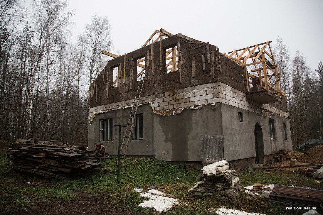 Хозяин садится в машину и везет нас к неудавшемуся дому. От его жилища до стройплощадки — не больше десяти минут езды. Крыша в коттедже отсутствует, к фасаду неаккуратно прибиты доски не совсем понятного назначения.