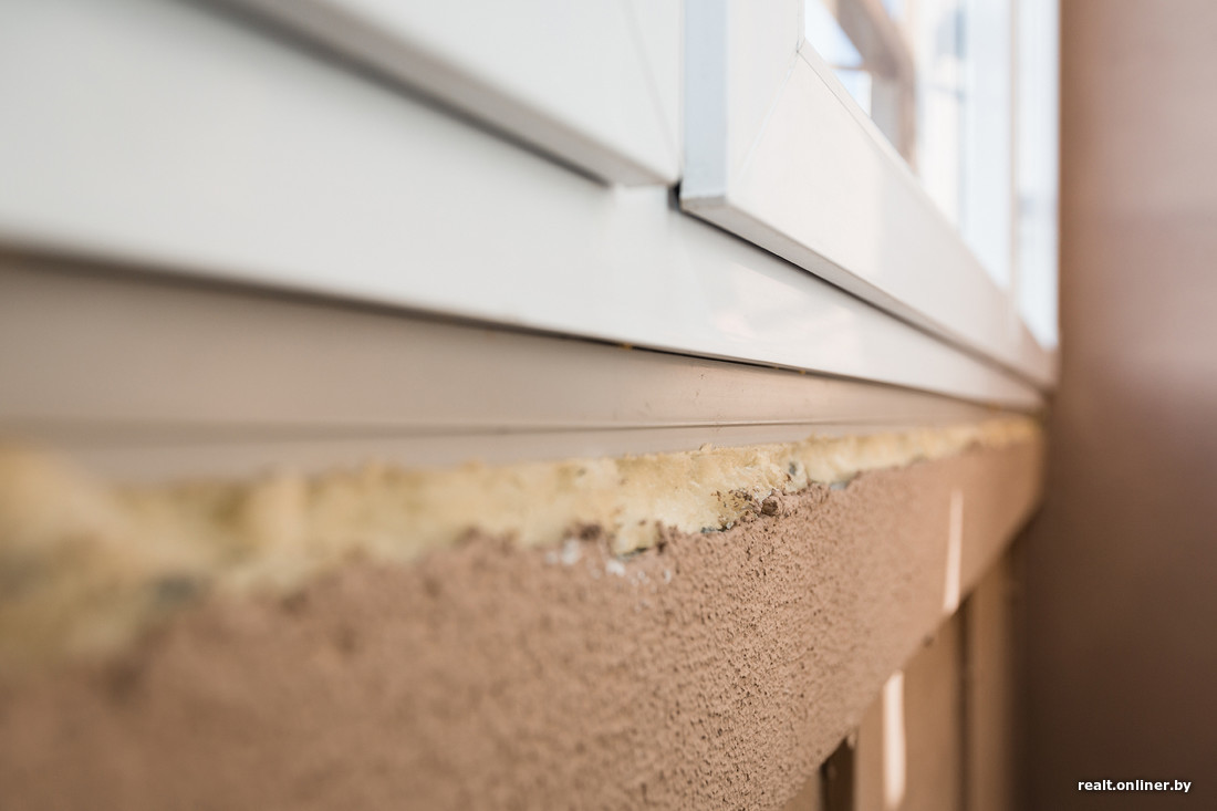 На лоджии внизу окна забыли установить нащельник. Порог тоже надо было сделать как-то аккуратнее, а мы имеем только пену с пароизоляционной лентой.