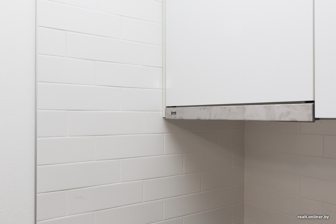 Между столешницей и холодильником находим «волну», но вопрос тут, скорее, к ровности боковой стены холодильника. Если образовавшаяся щель очень беспокоит, ее можно будет закрыть плинтусом. Еще одна небольшая щель есть в санузле — между столешницей, на которой крепится умывальник, и стеной. Этот нюанс можно засиликонить.