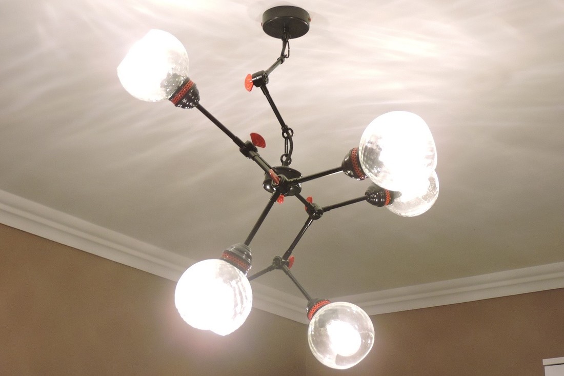 Так как в нашем небольшом городе особого выбора по освещению нет, нам пришлось съездить в Гомель. Пройдясь по нескольким магазинам, мы смогли купить только люстру в нашу с мужем комнату и точечное освещение. Все остальные люстры он делал сам. Люстра в прихожей сделана из гипса на металлическом каркасе и выкрашена красной эмалью в пять слоев. Изначально эту люстру муж делал для загородного дома, но, как только он ее закончил, стало понятно, что она поедет в квартиру.