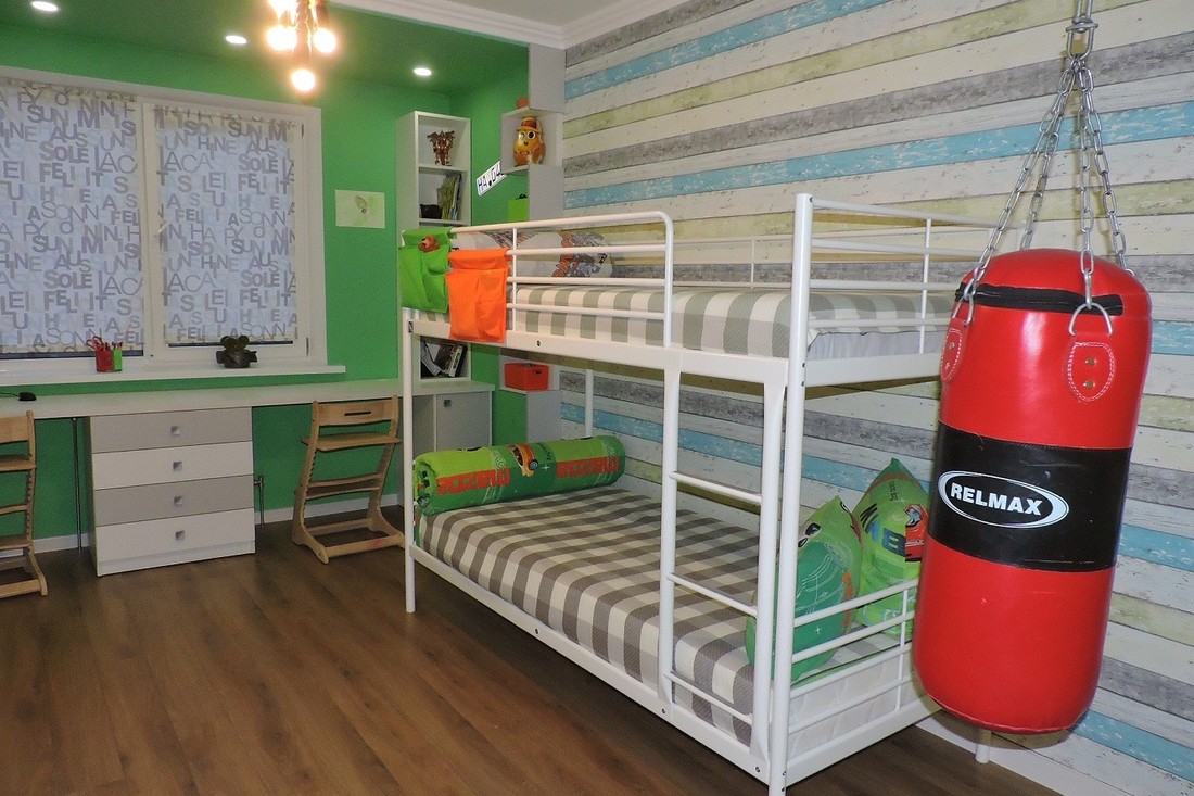 Люстра в комнате мальчишек делалась из толстого каната с бетонными наконечниками, а на основание люстры пошла деталь из старого уличного фонаря.