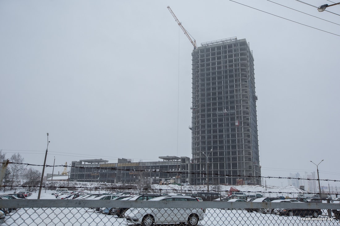 Чемпионат давно отгремел, Ладутько давно не мэр, а здание все стоит голое, неприкрытое, продуваемое ветрами. Растет оно медленно, незаметно, но все никак не дорастет до звания восточных ворот, чем, вероятно, очень печалится. Но печалится не только оно, но и минчане, которые вот уже восемь лет наблюдают за недостроенной громадиной, вторгшейся в зеленое и «ламповое» Уручье.