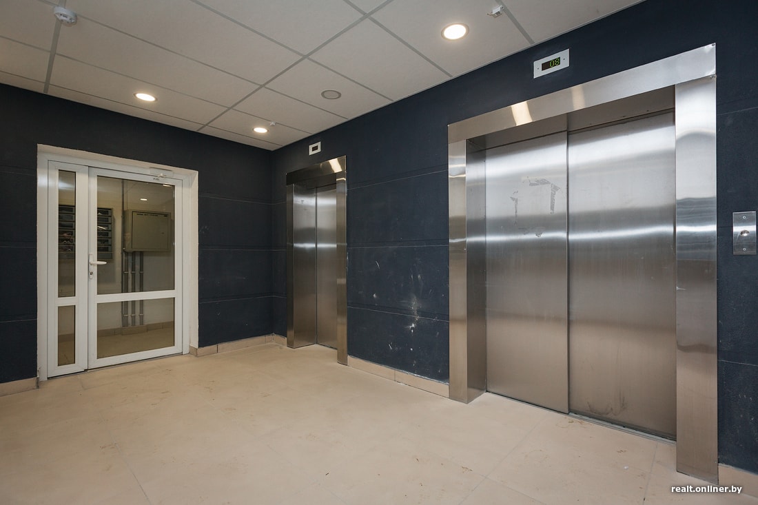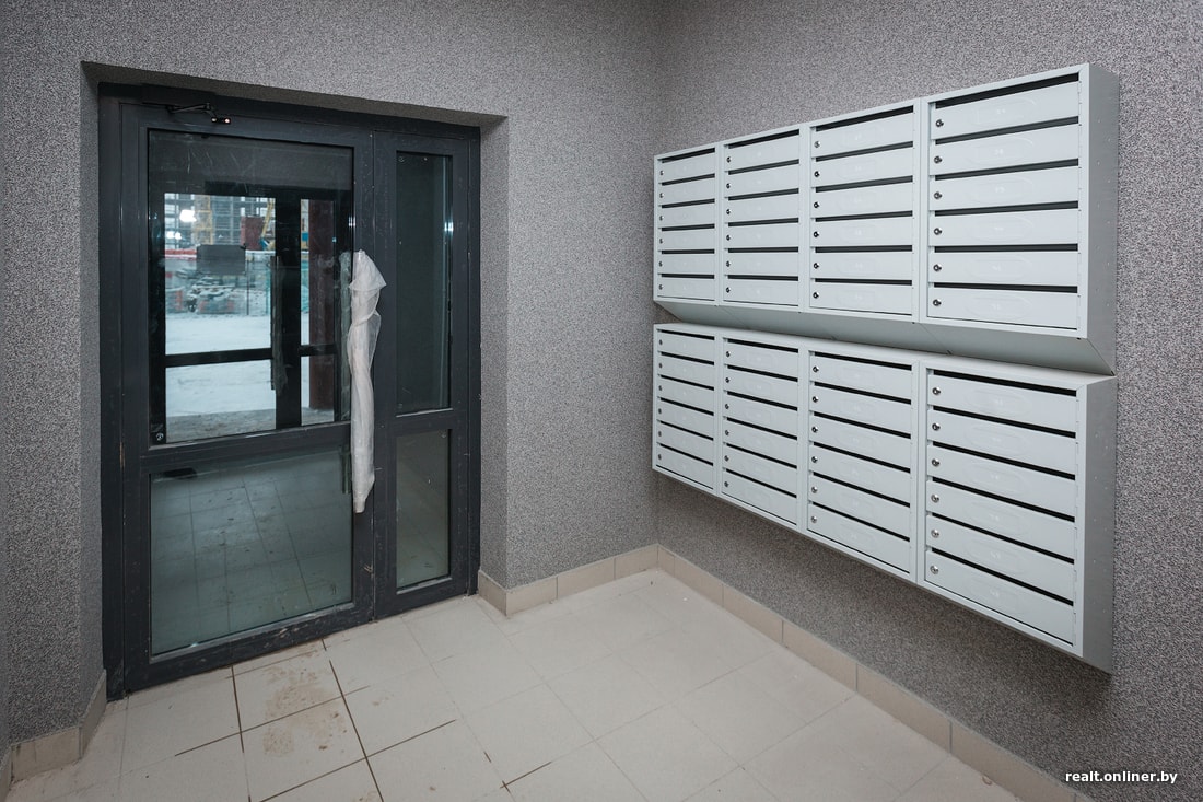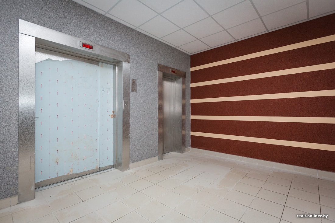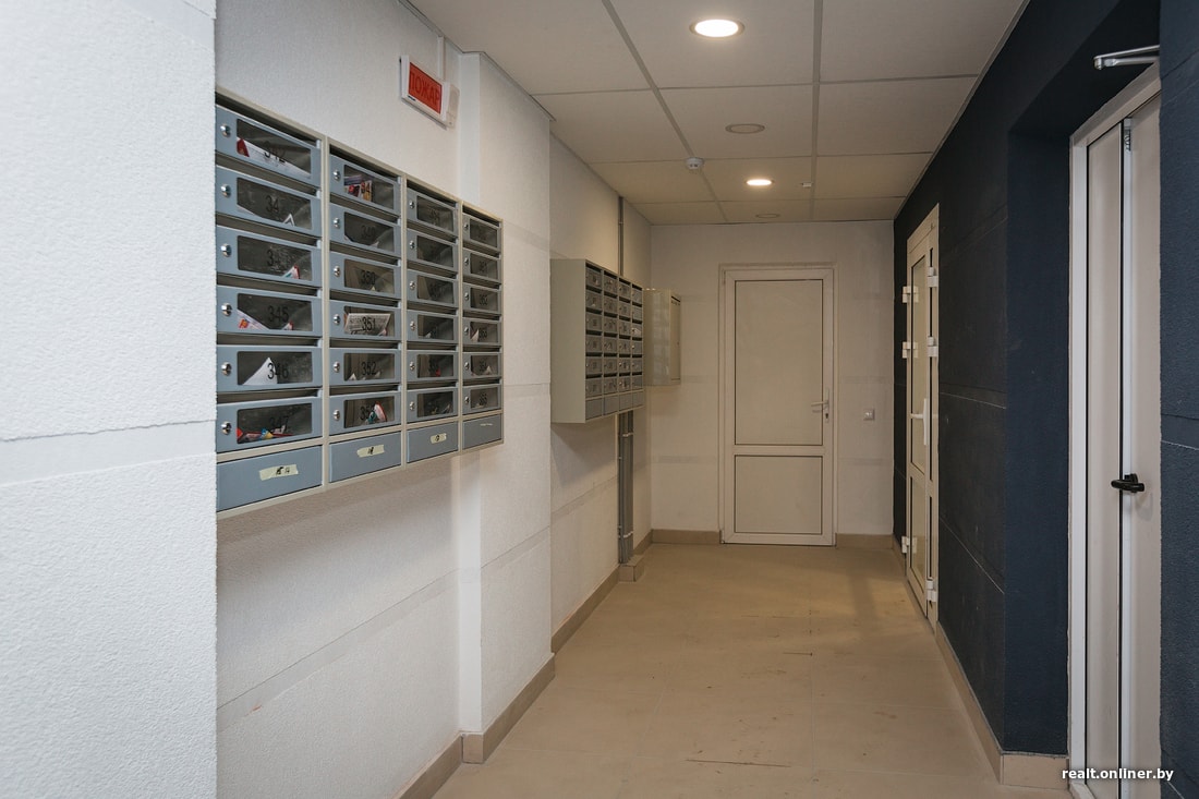 23-этажный «столбик» стандартной для «Мегаполиса» раскраски стал первым домом в жилом комплексе, где места общего пользования оформили не уныло: стеклянная входная группа и колерованная антивандальная декоративная штукатурка на стенах смотрятся выигрышно. А вот коридоры и лестничные площадки имеют обычный вид: серая плитка на полу плюс покрашенные стены. Лифты многоэтажке достались могилевские — четыре кабины на 132 квартиры. Мусоропровода, как того и требуют последние веяния моды и закона, нет.