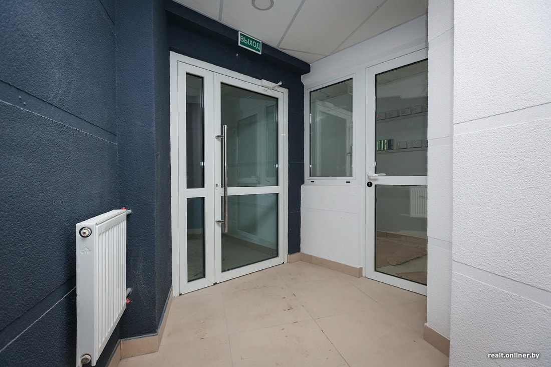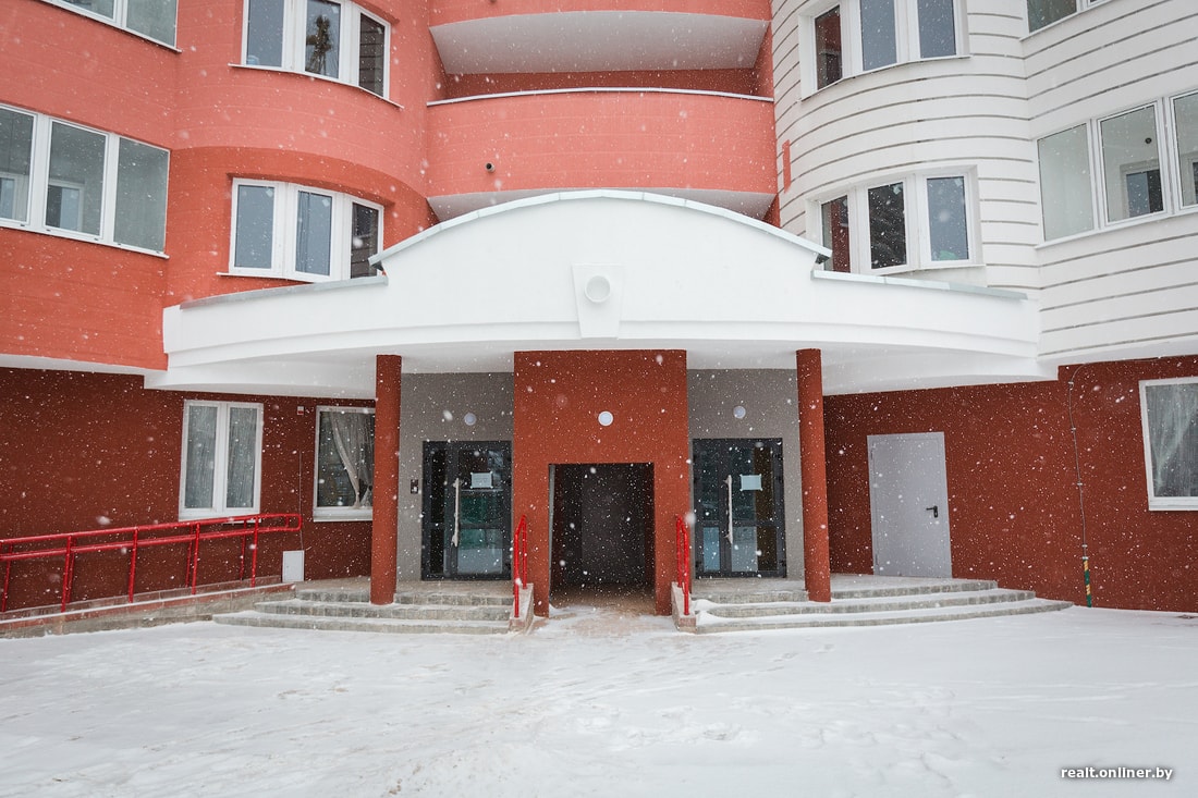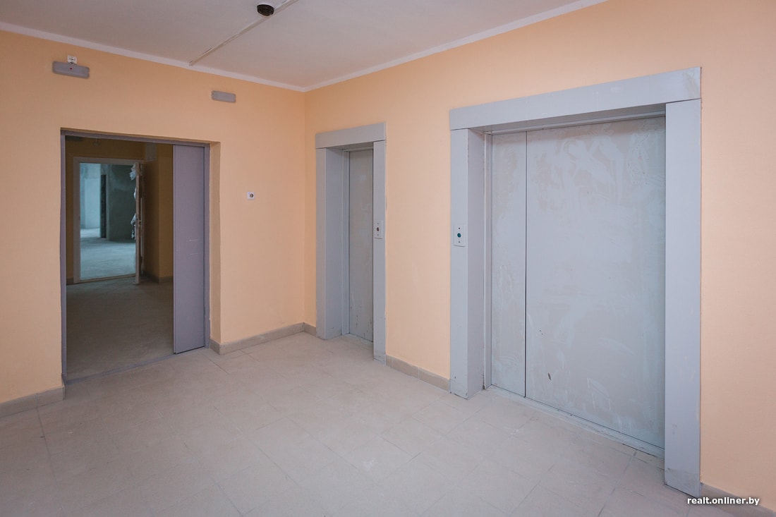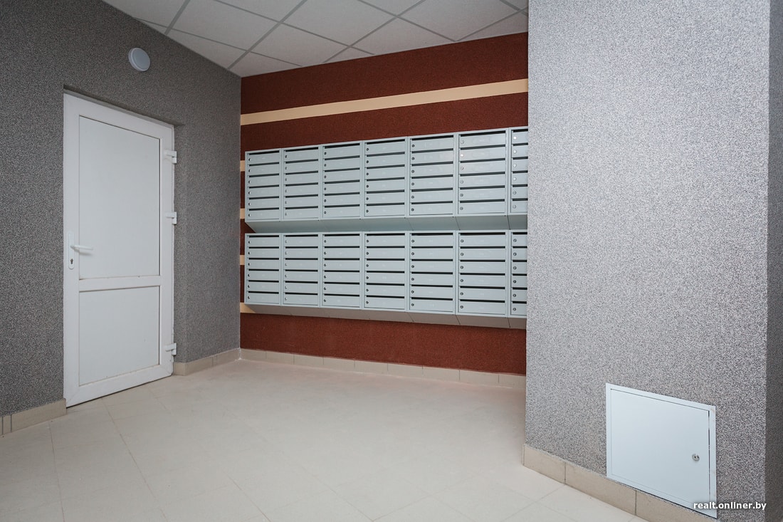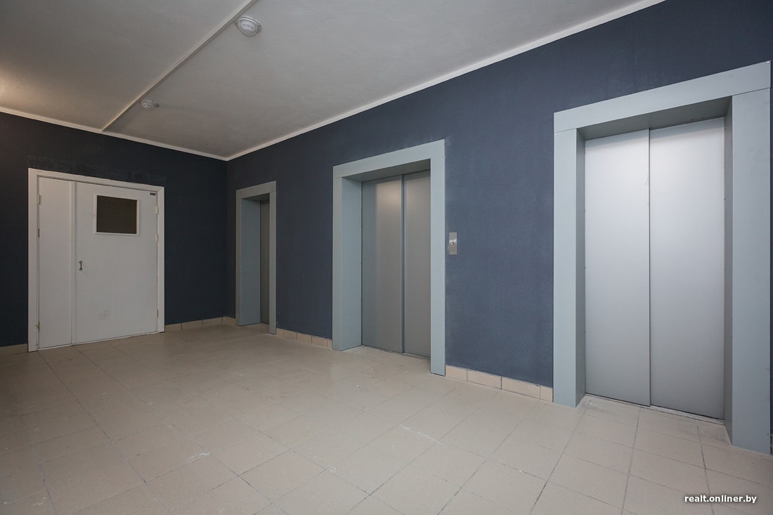 23-этажный «столбик» стандартной для «Мегаполиса» раскраски стал первым домом в жилом комплексе, где места общего пользования оформили не уныло: стеклянная входная группа и колерованная антивандальная декоративная штукатурка на стенах смотрятся выигрышно. А вот коридоры и лестничные площадки имеют обычный вид: серая плитка на полу плюс покрашенные стены. Лифты многоэтажке достались могилевские — четыре кабины на 132 квартиры. Мусоропровода, как того и требуют последние веяния моды и закона, нет.