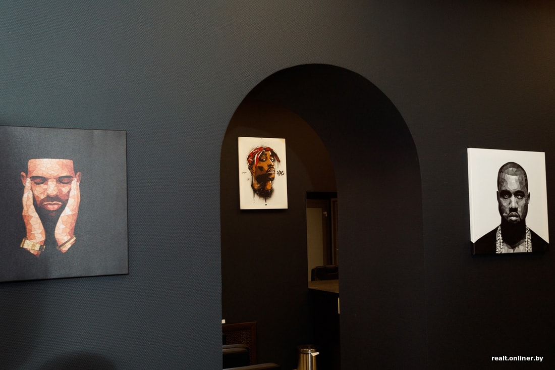 Интерьер минималистичный, навеян уличным стилем американского барбершопа: классическая шахматная доска на полу, черные стены, холсты с портретами рэперов.