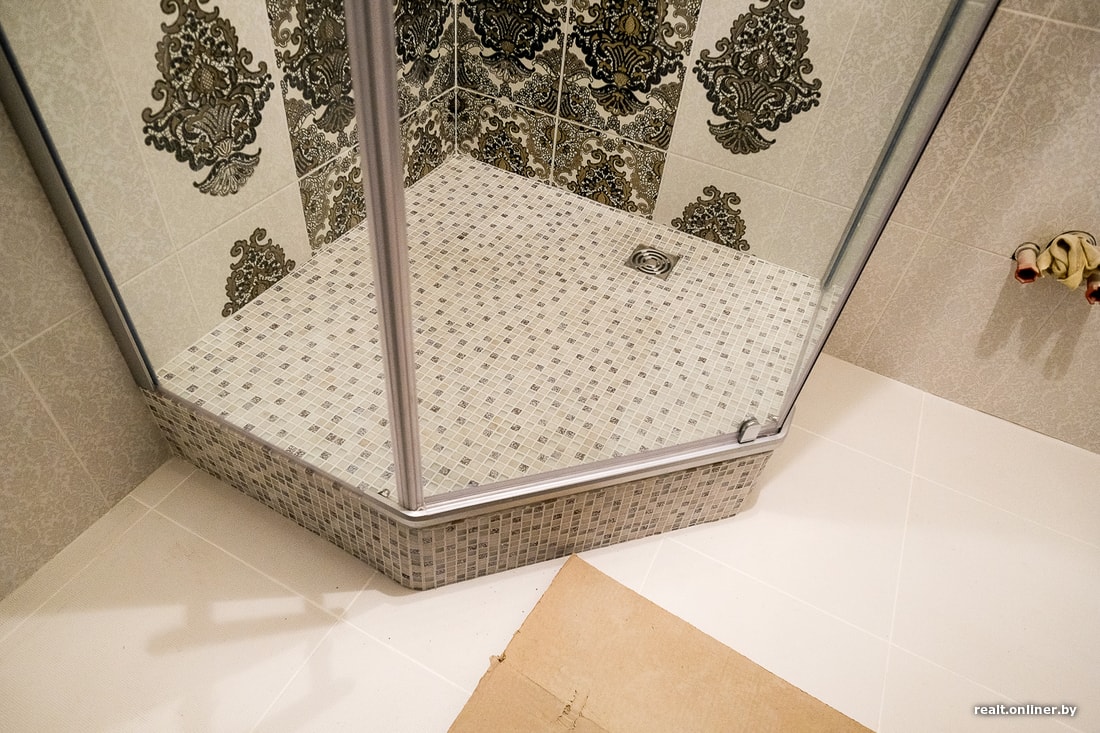 — Тот душевой поддон, который они нам сдали, был просто ужасным: он оказался большего размера (раковину было просто некуда ставить) и не стыковался со стеклянными дверцами. К тому же рабочие для чего-то решили сделать в нем бортики, хотя мы этого не просили. Плюс всю красивую мозаику испачкали эпоксидной фугой — из разноцветной она превратилась в грязно-коричневую. На все возмущения Андрей и Женя сказали, что отмывать фугу должны мы сами. Но добило нас то, что они так и не смогли сделать правильный уклон в поддоне и в нем лужами собиралась вода. В итоге и здесь свою ошибку они признали и вернули $350 за материалы и работу. Пришлось нам нанимать другого мастера, который бы сделал поддон таким, каким мы его хотели видеть. Благо в этот раз повезло.