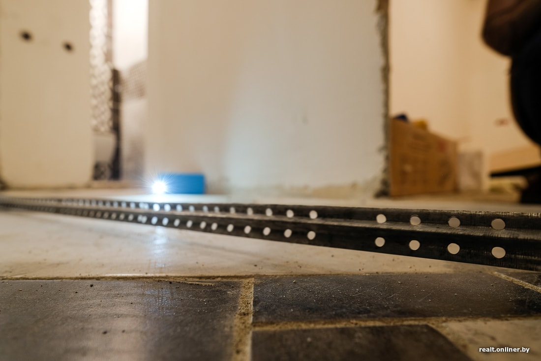 Пока собственники и мастера спорили по поводу качества облицовки туалета и ванной, парни работу не останавливали и трудились над полом в коридоре. Самонивелиром выровняли основание (за работу взяли $3 по курсу за метр) и стали укладывать саму плитку.