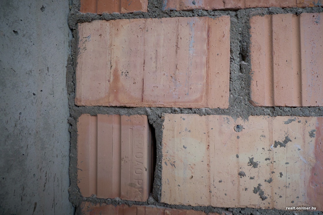 Стены — любимая часть приемщиков. Оставим ровность штукатурки (на фоне трещин это действительно мелочи) и сосредоточимся на главном. Чтобы обрисовать общую картину, представим вам образец кирпичной кладки в квартире, которую будто делали с закрытыми глазами.