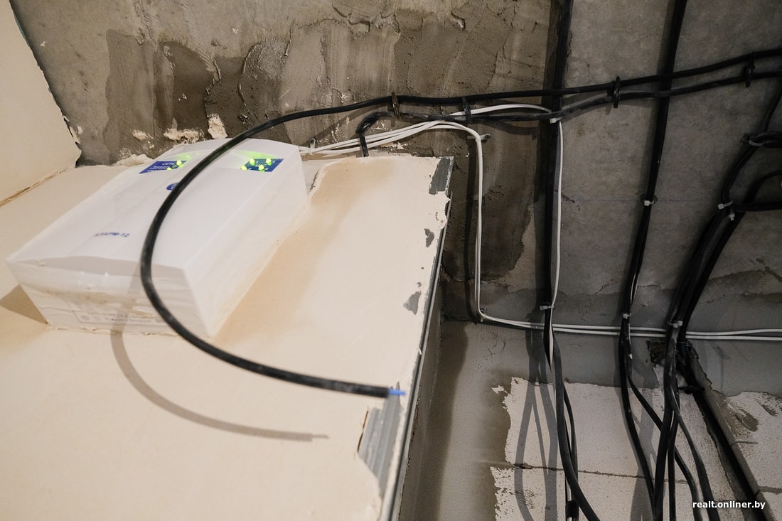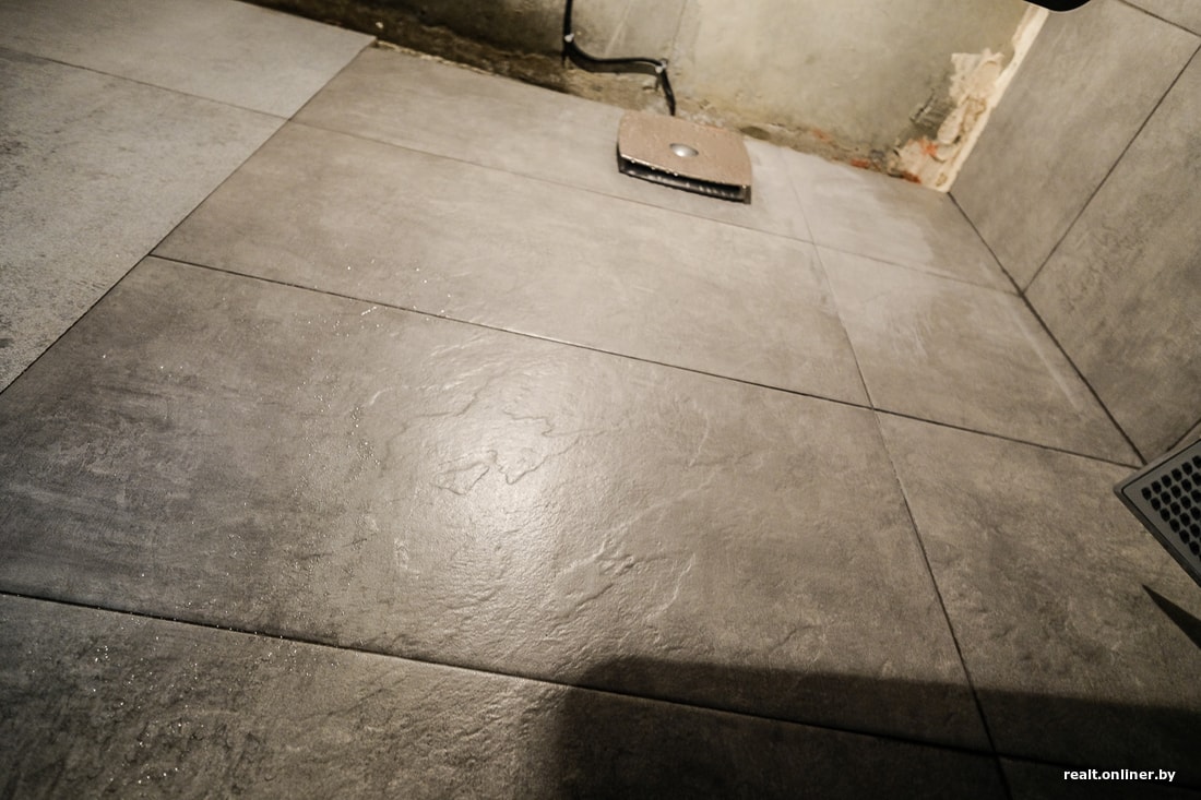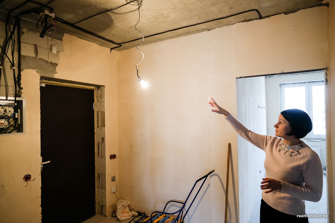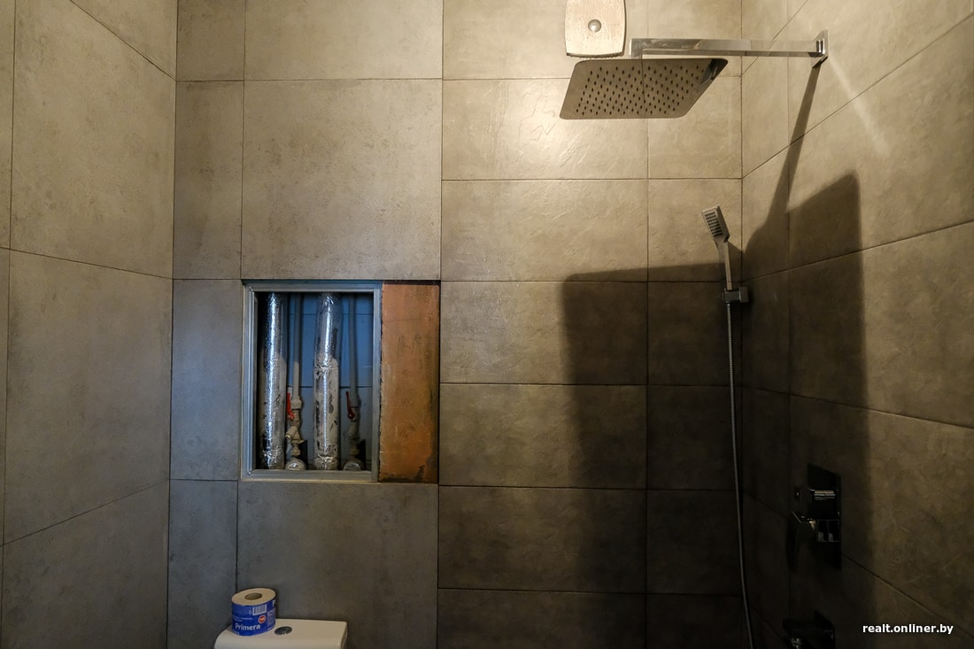 Супруги торопились заселиться, поэтому принялись за ремонт. Стратегия была простая: отремонтировать санузел, одну комнату, кухню и сразу переехать. Все остальное — по мере возможностей. Однако ремонт в ванной комнате стопорился из-за вентшахты — она то была мокрая, то высыхала на несколько дней. Минчане вычислили закономерность: когда на улице очень холодно, стена подсыхает. Плиточник успел подловить морозы и облицевал стены керамогранитом. Просушивали проблемное помещение при помощи тепловых пушек. За несколько дней накрутили 300 кВт. Правда, проблема обратной тяги так и не решилась: по словам Юлии, в санузле температура была примерно такая же, как на улице.