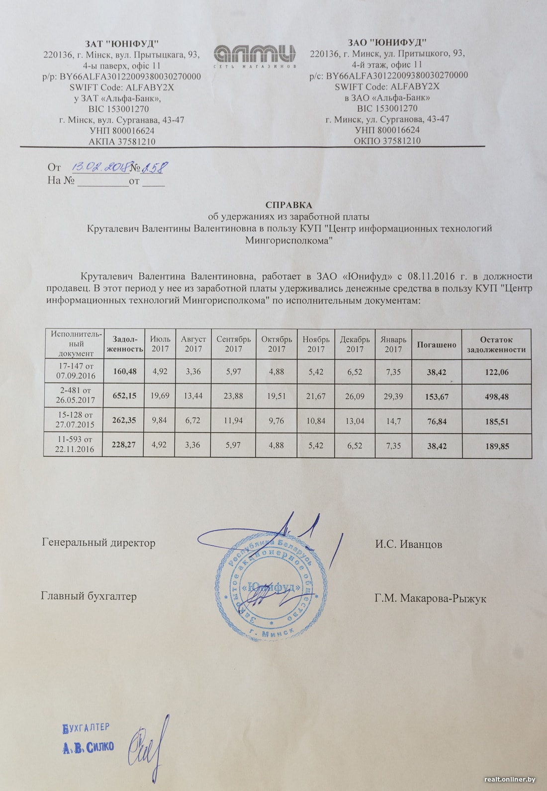 О том, что ситуация критическая, я узнала, когда на работу пришло очередное письмо: коммунальщиками было возбуждено новое производство, согласно которому из моей зарплаты стали автоматически вычитать деньги на погашение долга за квартиру уже за 2017 год. Поскольку образовавшийся долг разделили на троих совершеннолетних, прописанных в квартире, такая же бумага пришла и на работу к среднему сыну — удерживают порядка 75 рублей. То есть платежи, пусть и небольшие, все-таки пошли. А если суммировать все выплаты, то с меня ежемесячно удерживают более 300 рублей. Со стороны мужа денежных переводов вроде бы не было: работа у него сейчас неофициальная.