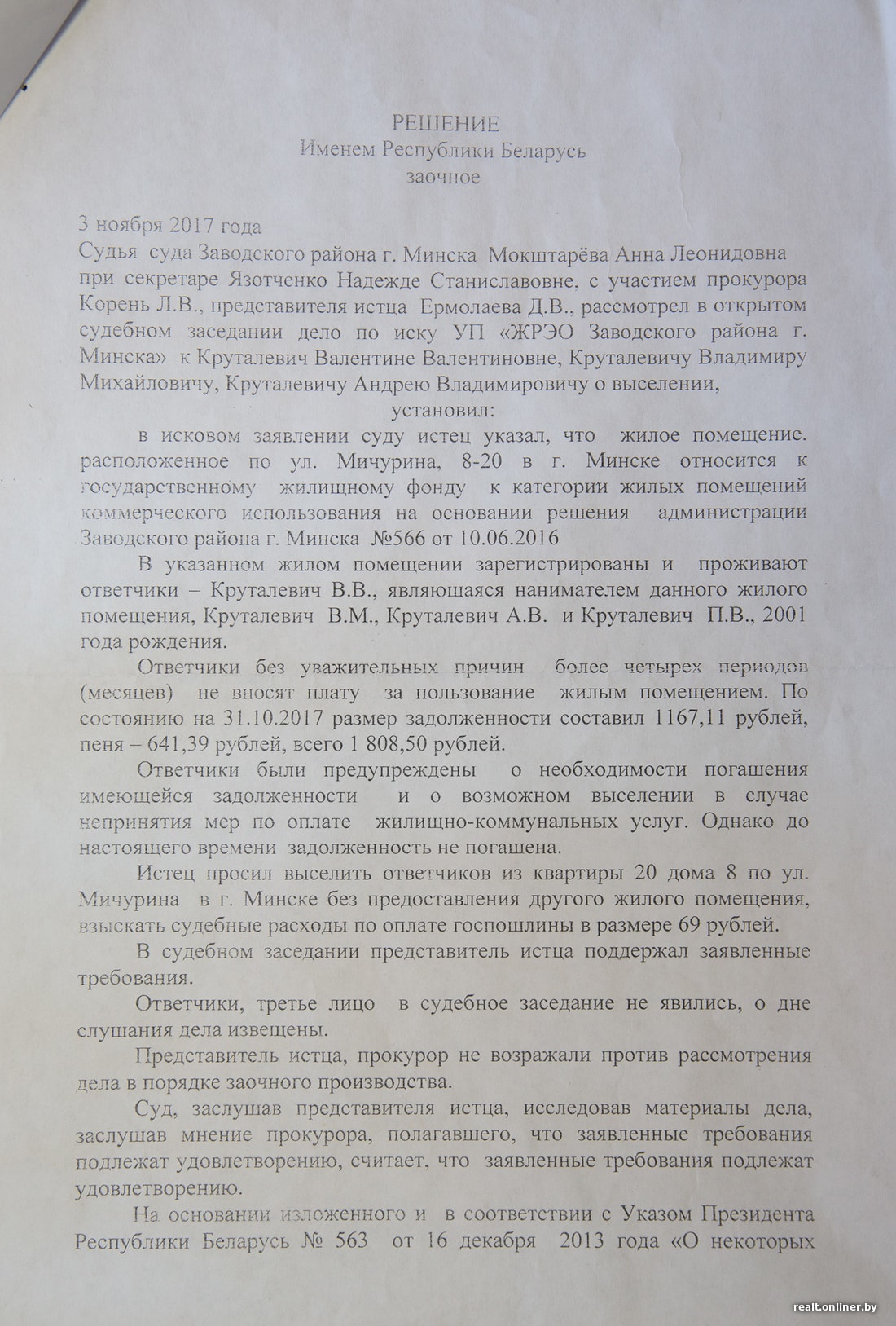 Копеечные удержания не могли исправить ситуацию, которая сложилась за последние месяцы. Видя, что долг полностью не погашается как минимум в течение четырех периодов, ЖРЭО Заводского района еще в прошлом году подало документы в суд на выселение всех, кто зарегистрирован в квартире, в том числе несовершеннолетней Полины. Иск суровый, без предоставления другого места жительства. Цена вопроса на конец октября — 1808,50 рубля (из них 1167,11 основного долга и 641,39 пени). Сейчас уже, конечно, больше.