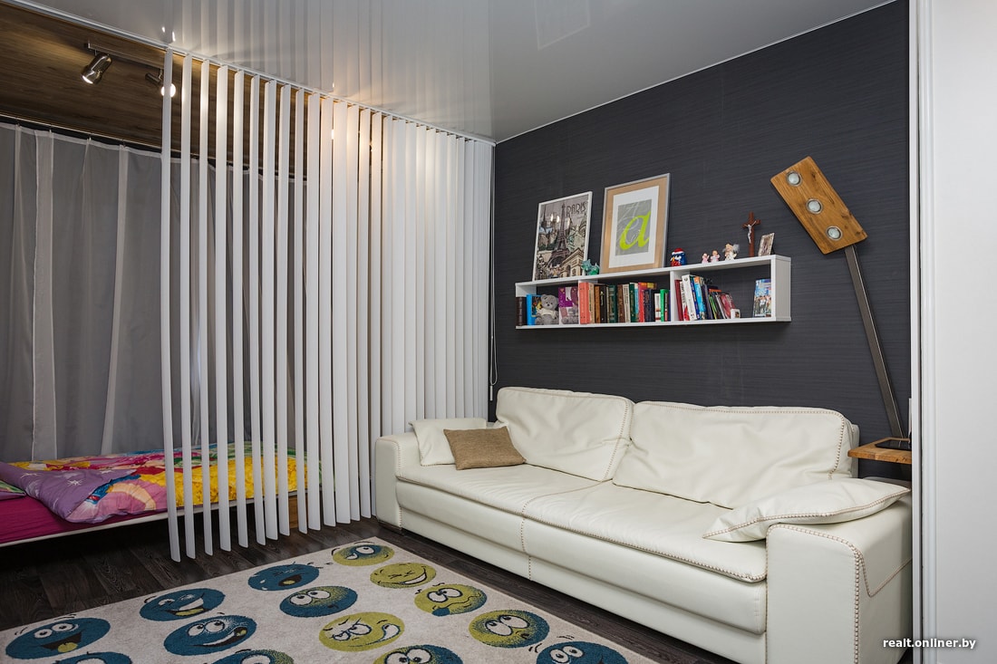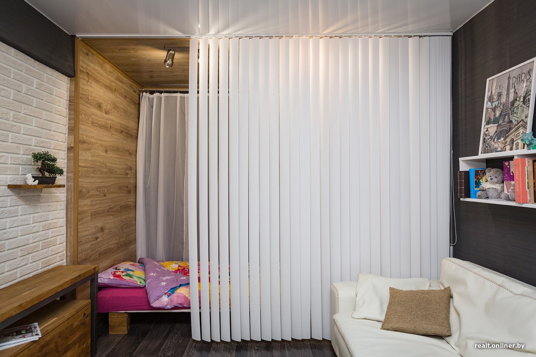 В нашей единственной жилой комнате проживают три человека. И было важно учесть интересы всех. Так, визуально у нас выделено три зоны: рабочая и гардеробная, зона для просмотра ТВ, сна родителей и игр дочки, а также зона отдыха дочки с возможностью закрыть ее выдвигающимися из-за шкафа жалюзи.