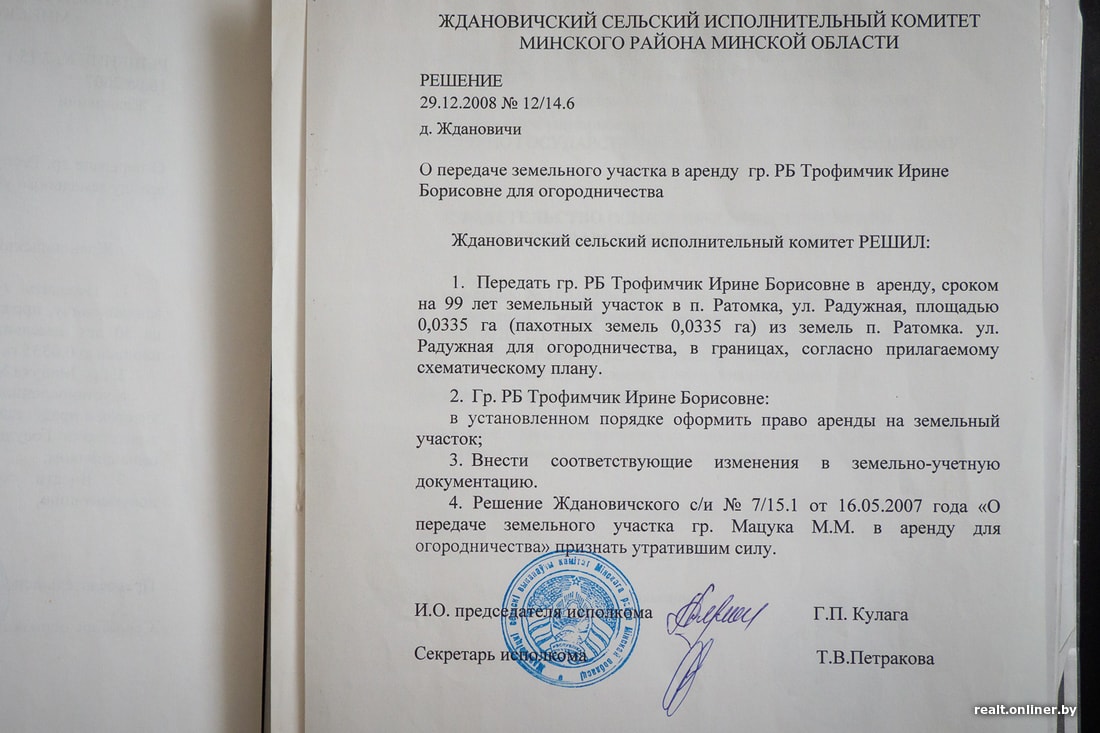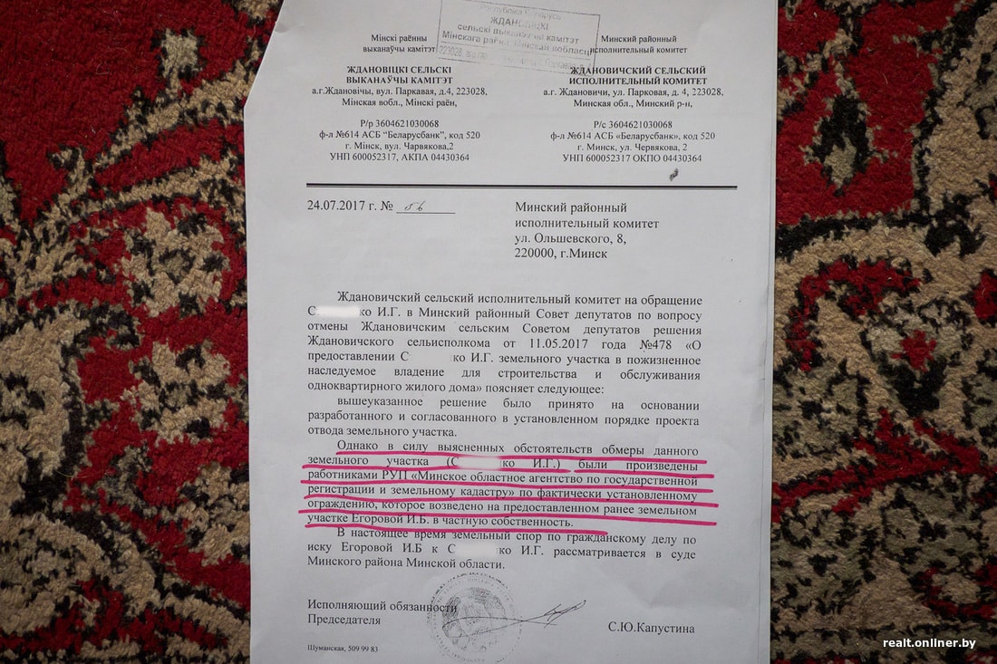 — 2 мая 2017 года я пишу заявление в исполком, в котором прошу в связи с начавшимся судом продлить вынесенное ранее решение о предоставлении мне неприватизированной части участка в пожизненно наследуемое владение до того момента, как я получу документы из кадастрового агентства. Обращение регистрируют, но спустя буквально 10 дней выносят другое «эпохальное» решение: моему соседу вдруг предоставляют в пожизненно наследуемое владение участок площадью почти 12 соток!
