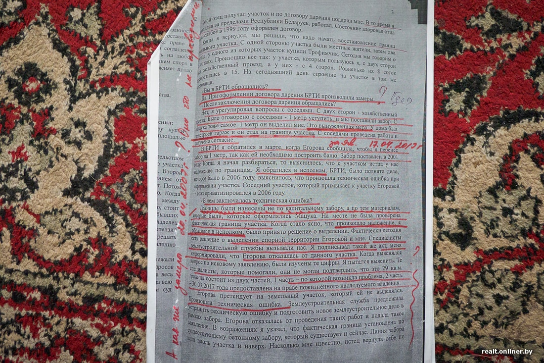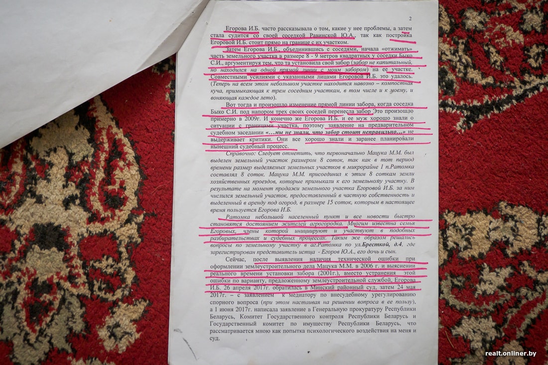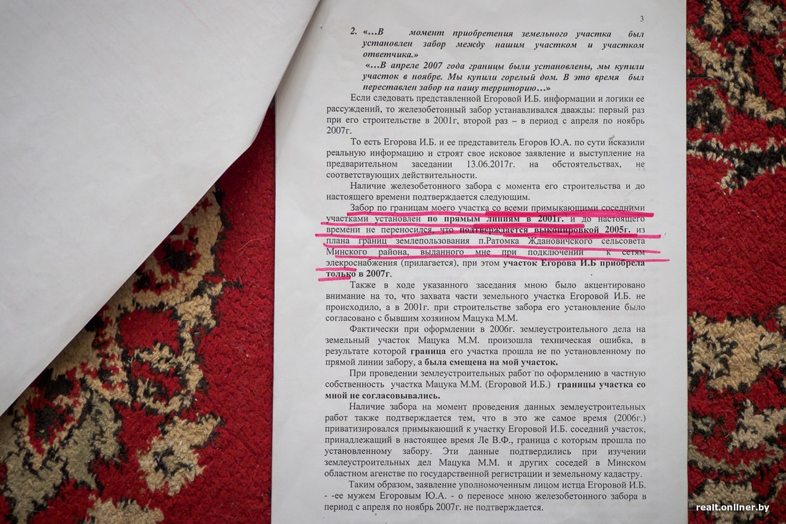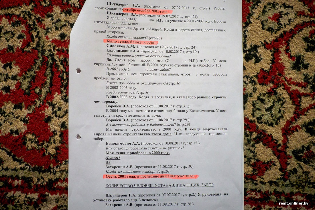 — Я, как и она, еще не ознакомился с материалами дела. Скажу только следующее: прежде чем начинать процедуру в установленном судебном порядке, она написала несколько жалоб на меня в вышестоящие органы. Проводились проверки. Как я понимаю, это была попытка оказать давление на меня, чтобы я согласился с ложной информацией, которую она подала первоначально. Проводились судебные заседания, были опрошены люди, которые занимались этим вопросом (установкой забора. — Прим. Onliner.by).