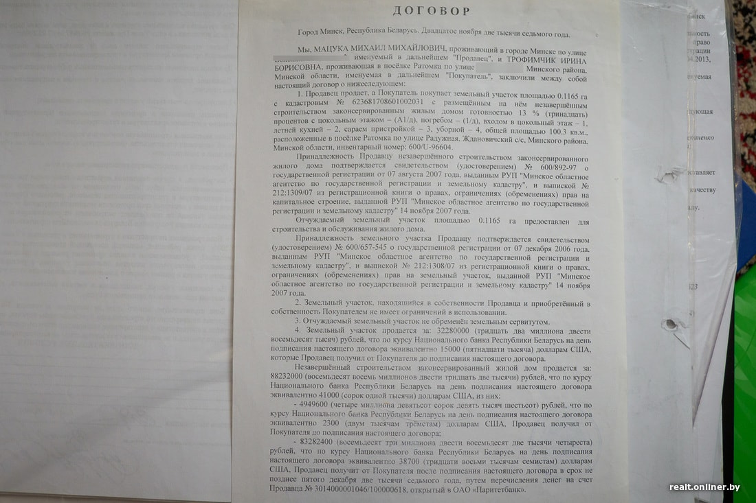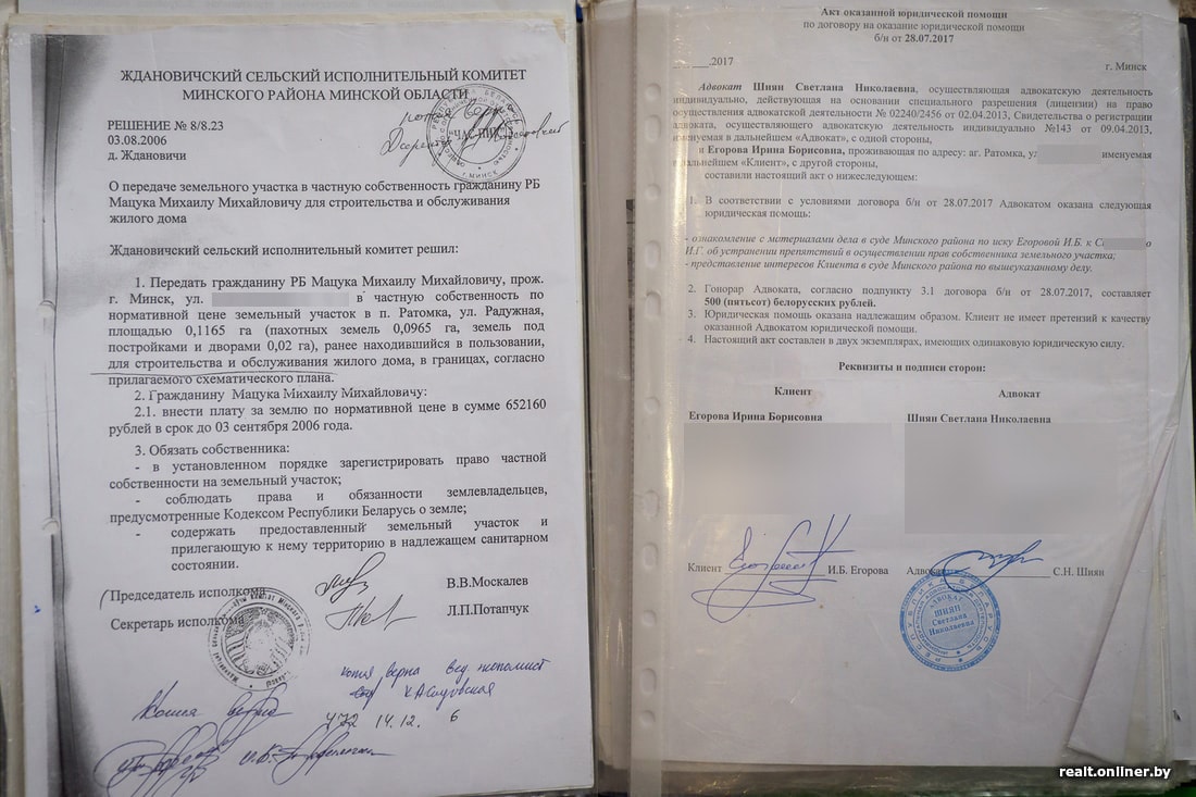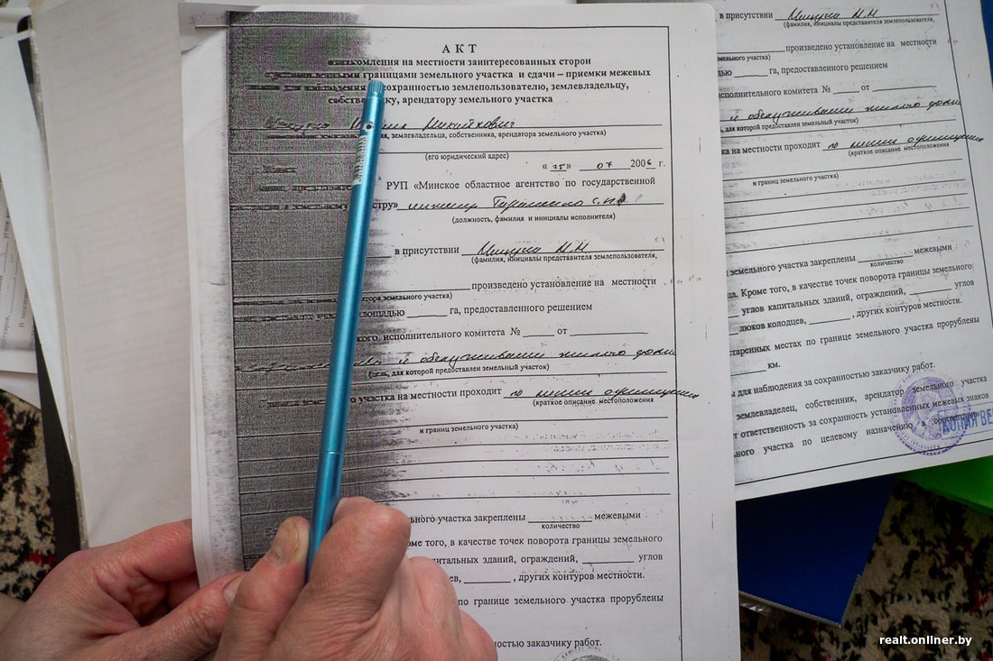 После выходных поспешила в сельсовет, чтобы разрулить ситуацию: мало ли какие документы всплыли или еще что. Стали вместе проверять бумаги, и выяснилось, что землепользователя на смежном с нашим участке вообще не зарегистрировано. Его не существует! Непонятно. Обратилась в агентство по госрегистрации и кадастру — такая же ситуация. Единственный документ, который подтверждал хоть какое-то отношение С-ко к земле, — это распоряжение Ждановичского сельсовета от 15 мая 1991 года о выделении земельного участка площадью 8 соток для строительства жилого дома С-ко Г. М., отцу моего нынешнего соседа. После этого не было приватизации или даже попыток ее оформить. Более того, по состоянию на июнь 2017 года нет регистрации ни земельного участка, ни капитального строения на нем. Также мне удалось выяснить, что в 1999 году был составлен договор дарения незавершенного строительства отцом сыну. Есть еще и бумага из налоговой о том, что сосед Иван уплачивал земельный налог с площади в 8 соток. На этом все, больше никаких документов обнаружить не удалось. С моими же бумагами все в порядке, — возмущена жительница Ратомки.