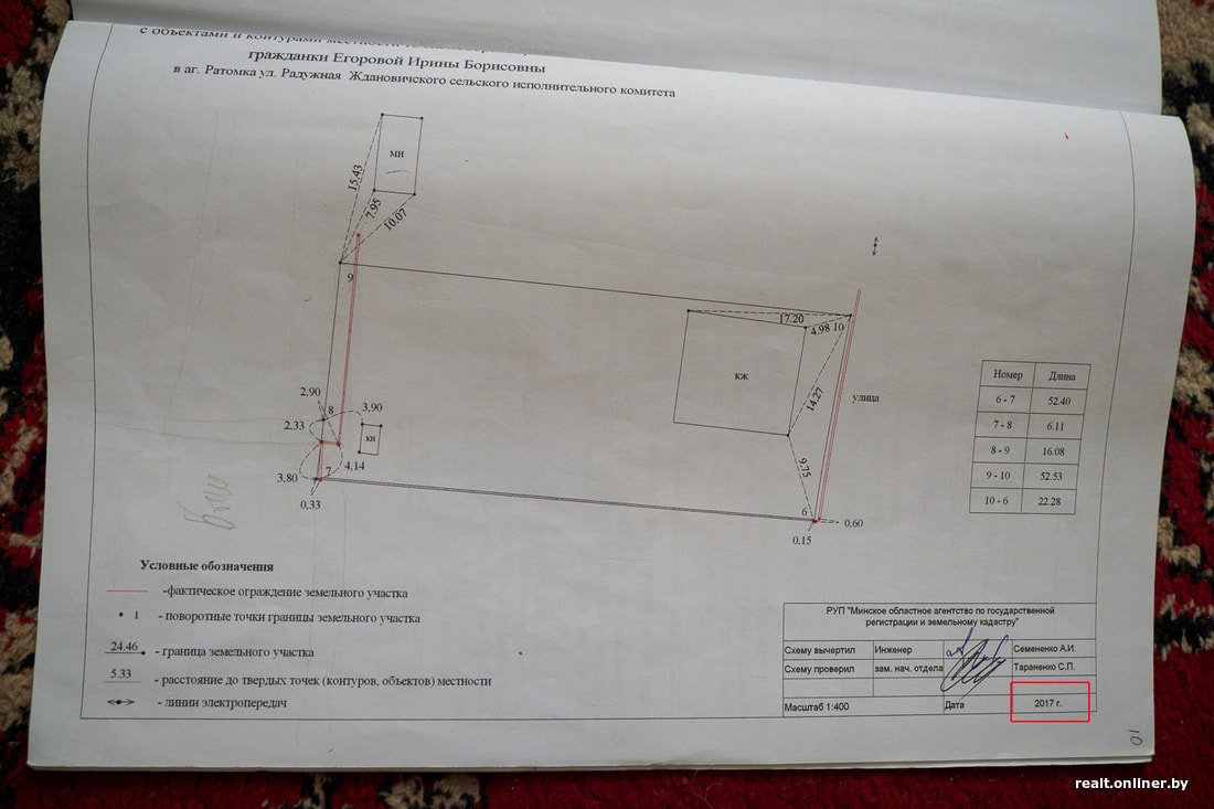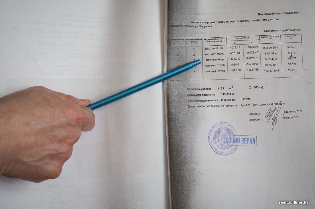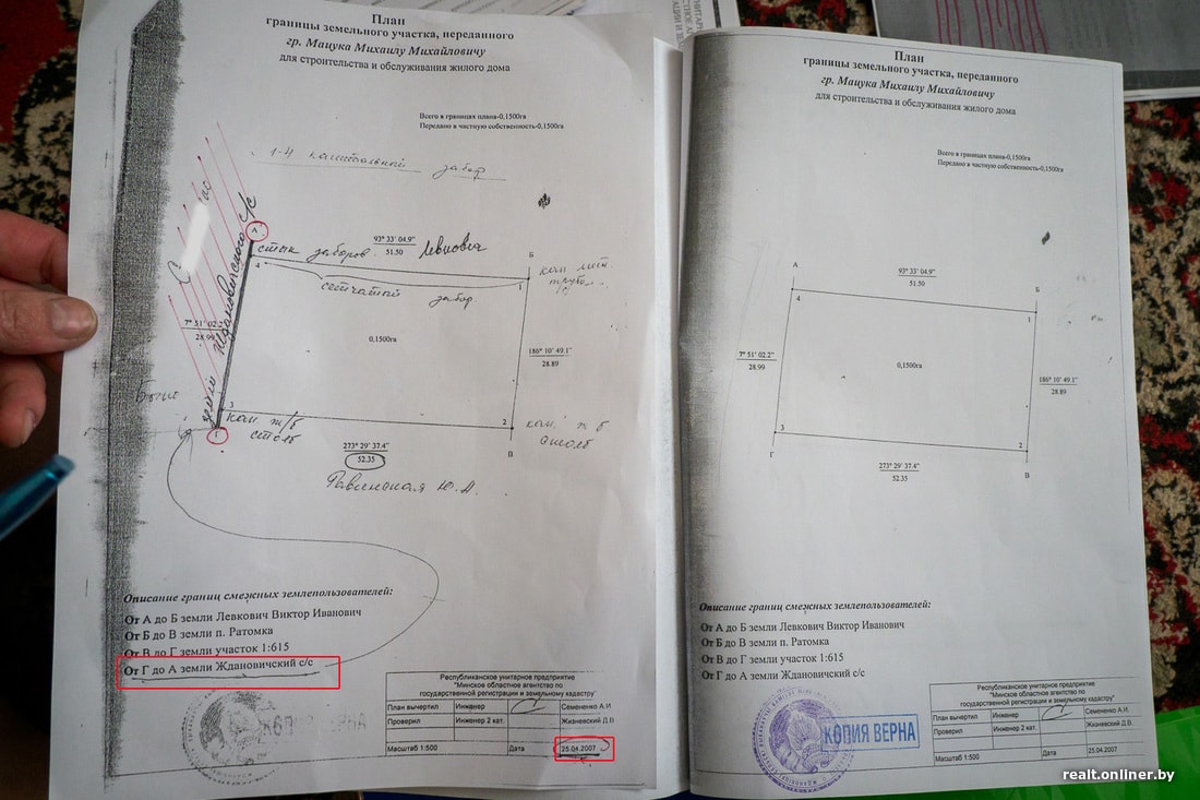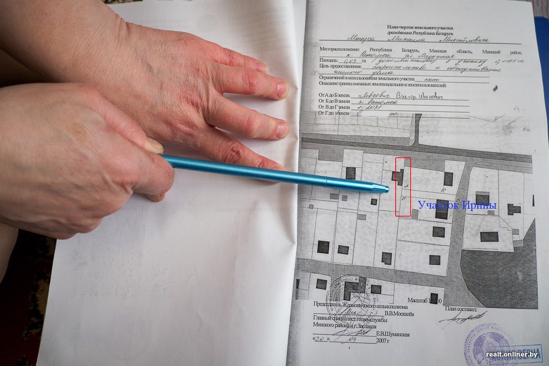 — В землеустроительном деле указаны четыре точки — так называемые углы поворота границ, — продолжает рассказ Ирина. — Они являются капитальными (потому, собственно, и указаны): металлическая труба, два железобетонных столба и стык заборов (сетчатый забор соседки и такой же сетчатый продавца). О существовании железобетонного забора со стороны соседа нет ни слова. Естественно, эти точки были отражены на плане. К цифрам, буквам и точкам прилагалась расшифровка: от А до Б — земли соседа Левковича, от Б до В — ратомские земли, от В до Г — участок соседки, который на тот момент не был приватизирован, и от Г до А (та самая граница, из-за которой и возник конфликт) — земли Ждановичского сельсовета. То есть торец покупаемого мной участка, согласно представленным официальным документам с печатями, не имел границ с физическим лицом. Земля принадлежала сельсовету, который год назад дал разрешение на приватизацию. Более того, согласно более ранним выкопировкам, конкретно в этом месте участок примыкал вообще к хозяйственному проезду, который впоследствии люди поделили между собой.