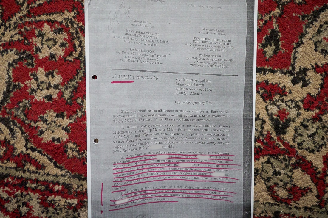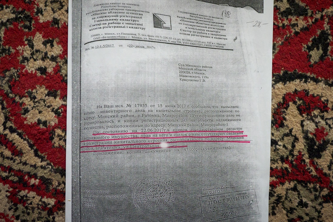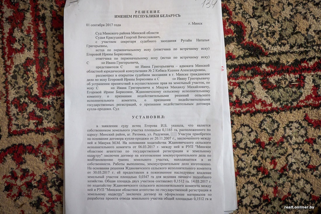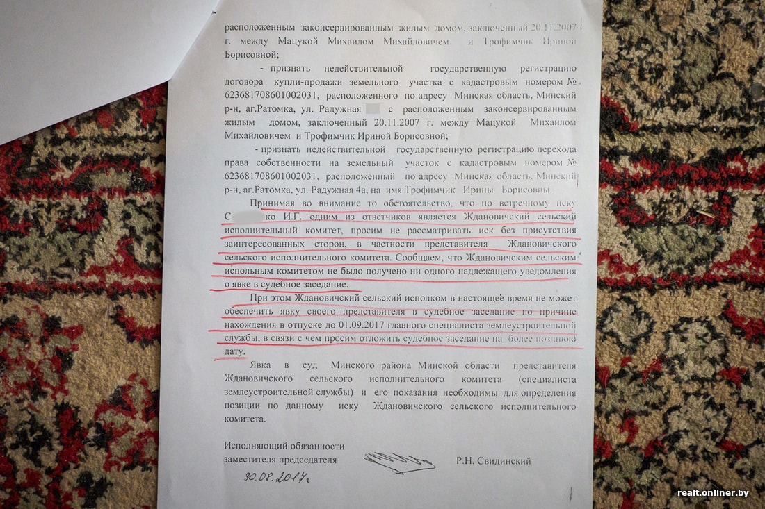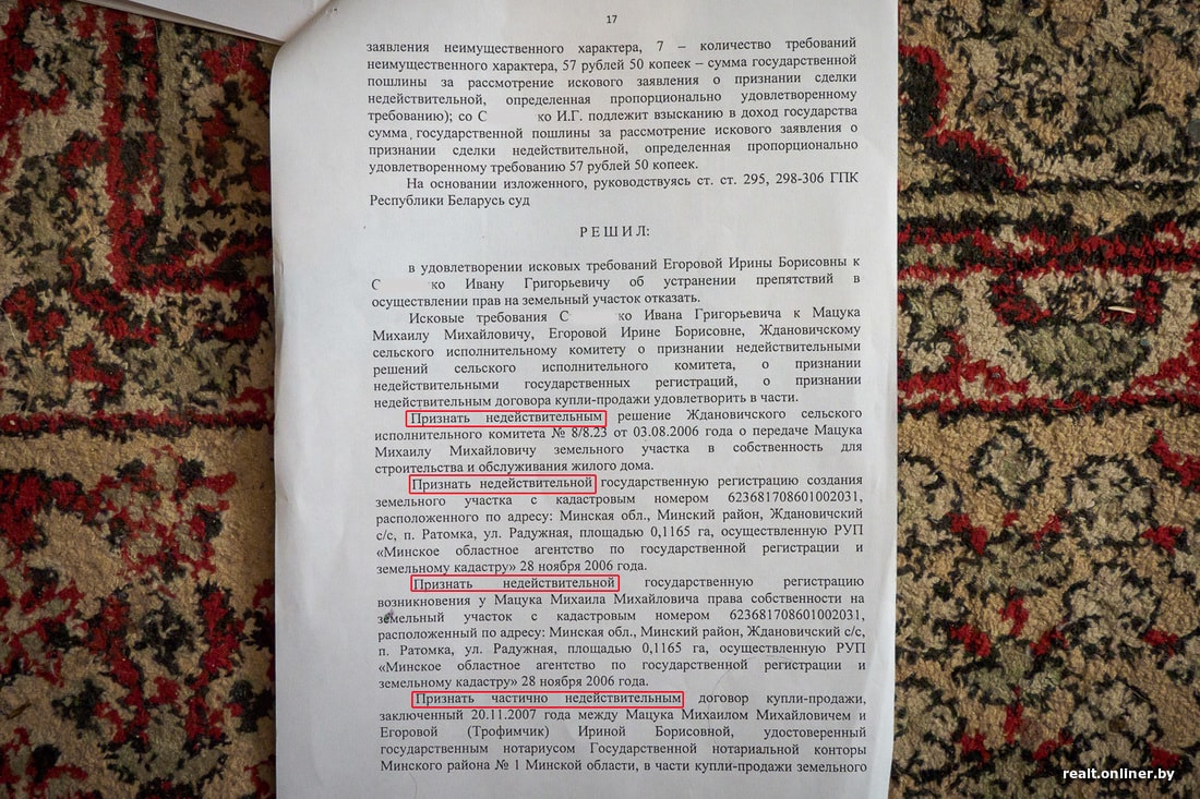 Одним решением суда меня, добросовестного покупателя, лишили всего. Получается, 10 лет назад я заплатила ни за что и налог все это время оплачивала за воздух. Теперь у моей семьи нет ни родины, ни флага, — переживает Ирина. — Я подала кассационную жалобу, написала в прокуратуру. Но это, похоже, все пустое. К примеру, прокуратура Минского района сначала вынесла протест, посчитав, что судебное решение является необоснованным, незаконным и подлежит отмене. А потом отозвала его. Минский областной суд тоже оставил все без изменений.