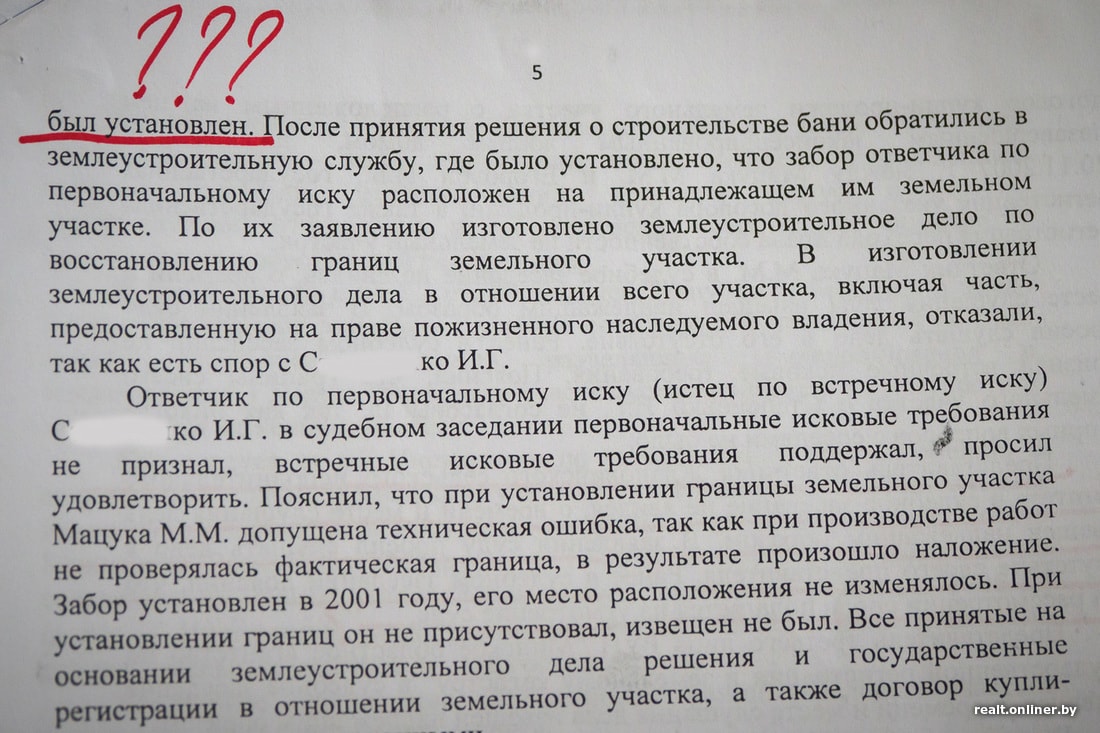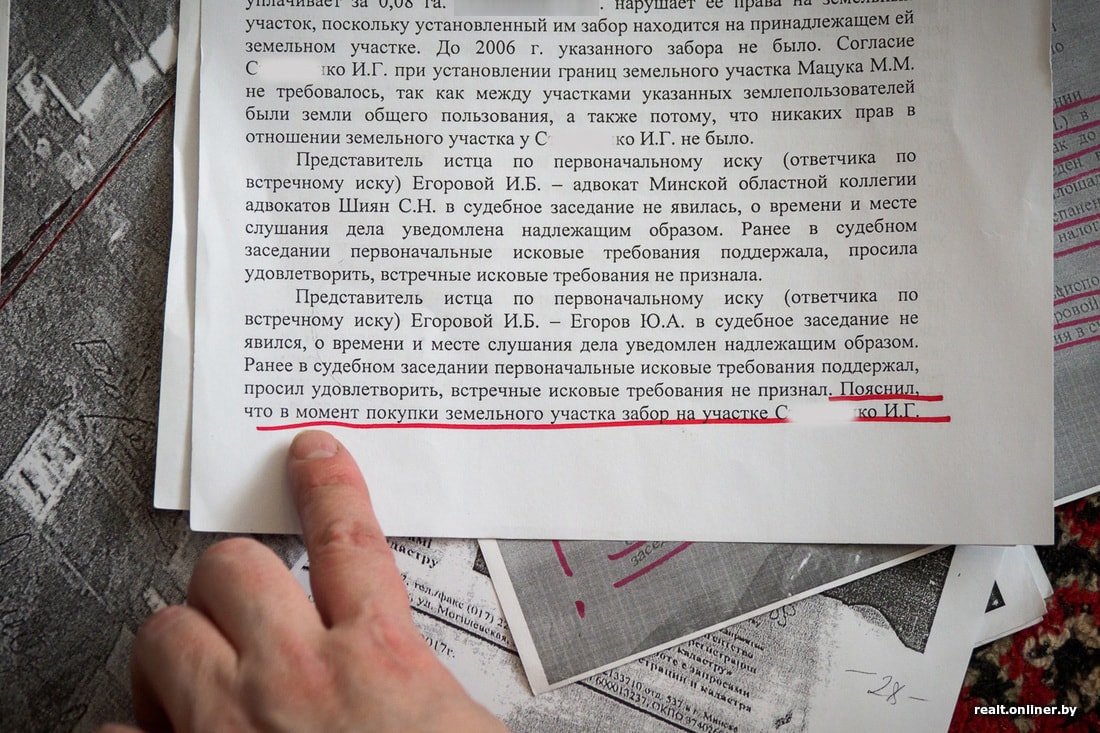 Судебные слушания — это отдельный разговор. На предварительном заседании в качестве моего представителя выступал муж. Он объяснял, что в момент приобретения земли между нашими с соседом участками стоял забор из сетки. Между, а не на нашей земле! Также муж предположил, что сосед, узнав о том, что участок продается и у него, по сути, какое-то время не будет хозяина, возвел свой забор на нашей территории. На это у него было около полугода. Но в мотивировке суда мы увидели совсем другое, слова мужа были перекручены.