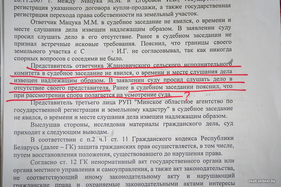 Принципиальный товарищ С-ко, который, видимо, имеет активную гражданскую позицию (иначе чем объяснить рвение не существующего юридически человека?), подал иск к Ждановичскому сельисполкому об отмене приватизации расположенного рядом земельного участка. И что бы вы думали? Он с легкостью выиграл дело. Были удовлетворены и остальные его требования: отменить выделение участков, признать недействительной госрегистрацию права собственности, продлить право пожизненно наследуемого владения и так далее.