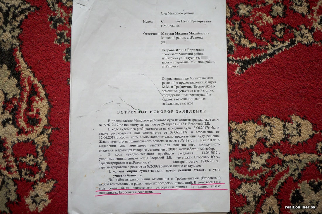 Реагируя на мой иск, ответчик подал встречный — о признании недействительным решения сельсовета о выделении земли продавцу, а затем мне — о признании всех сделок и манипуляций с участками недействительными. Ну и, само собой, о продлении его права пожизненно наследуемого владения. Аргументы при этом были умопомрачительные: еще во времена Мацука закралась техническая ошибка (границы наложились друг на друга), а я якобы конфликтую с соседями и тягаю их по судам, «отжала» участок у соседки Быко и вообще спланировала все заранее.