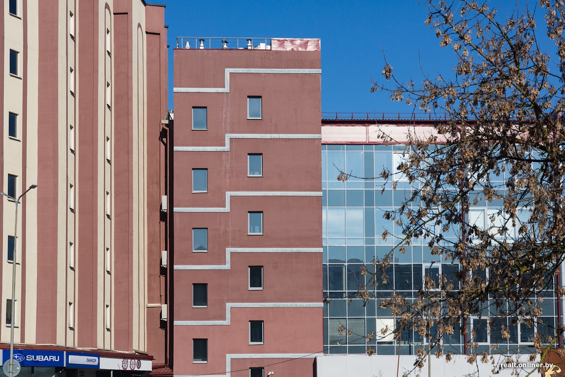 Один из главных минских долгостроев ввели в эксплуатацию в прошлом году. Это событие почему-то не освещалось в СМИ и осталось незамеченным. Основное здание, как и задумывалось в 1980-х, используется как гараж-стоянка. Только паркуются здесь машины физлиц, а не скорой помощи. Часть первого этажа занял автоцентр Subaru, в пристройке разместились офисы. В частности, здесь обосновалась компания Regula — крупнейший производитель приборов для проверки подлинности документов и банкнот.