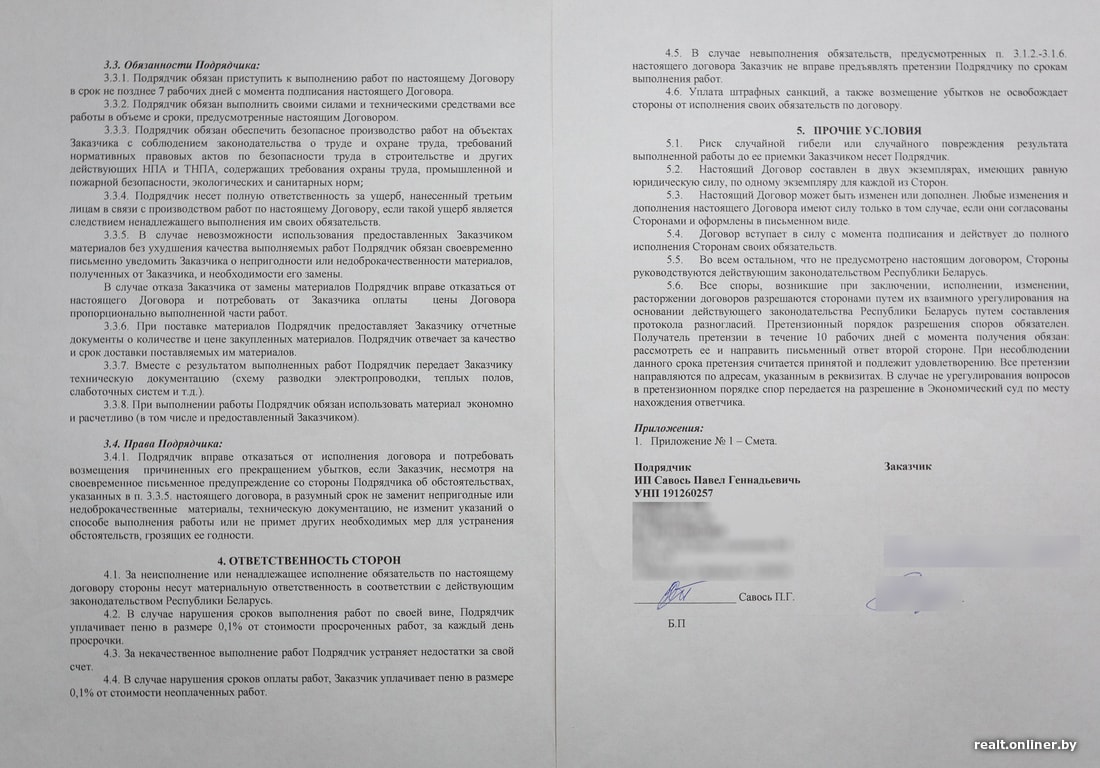 Не обошлось и без денег: за демонтаж, монтаж, электрику и тому подобное минчане рассчитывались по факту выполнения работ. Уверяют, что сразу же выдали аванс на закупку черновых стройматериалов — 7334 рубля, а взамен получили расписку, написанную от руки. Позже, как говорят ребята, Павел предложил «для красоты» видоизменить расписку на печатный вариант — так возникла дата 9 августа 2017 года.