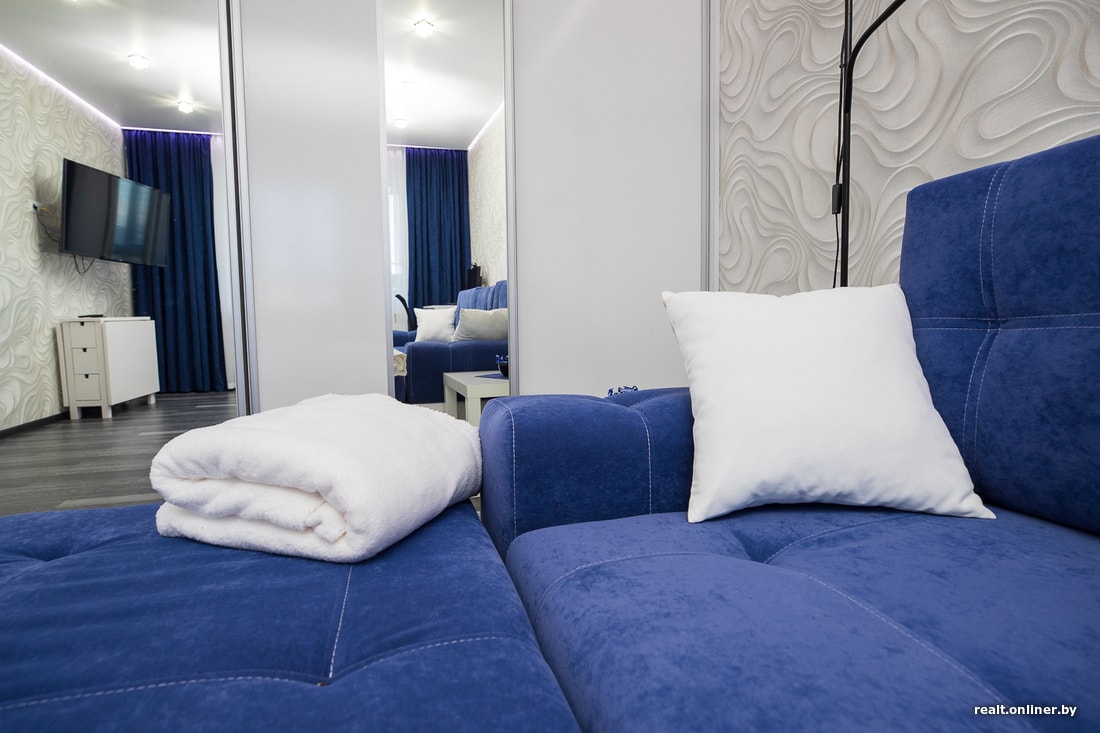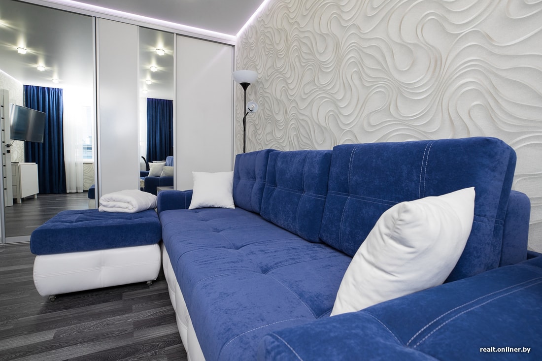 Приступая к ремонту, я долго думала, стоит ли делать перегородку в большой комнате, но склонилась к тому, что она нужна. И сейчас убедилась в своей правоте. При этом спальню я хотела сделать небольшой и уютной, а столовую — более просторной. Так появилось решение о разделении общей площади. С этой задачей справились братья, возведя стену из блоков между комнатами. Правда, не обошлось без небольшого «косячка»: при включении диодной ленточной подсветки видны все неровности. Но мы же не профессионалы — нам простительно. Я уже придумала, как скрыть этот недостаток: ищу большую картину в бордовых тонах.