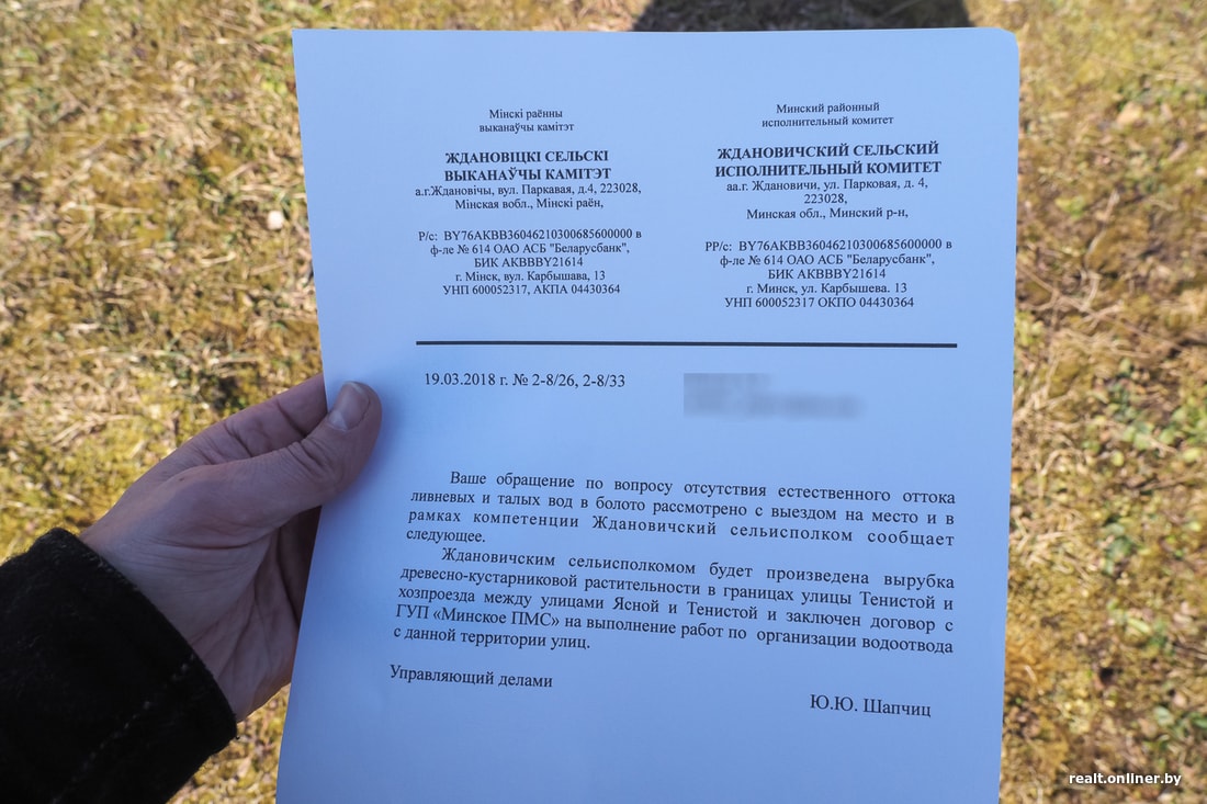 К тому же на видном месте в сельсовете висело объявление, мол, скоро по улице Ясной проведут центральную канализацию. Это стало дополнительным стимулом побороться за участок. Однако, когда пришло время торгов, оказалось, что я единственный заявитель — 31 мая 2017 года забрал землю за $48 500 по курсу. Еще до покупки я знал, что это низина, рядом болотистая местность, но конкретно мой участок всегда был сухой. Поэтому появления таких проблем я и не предполагал.