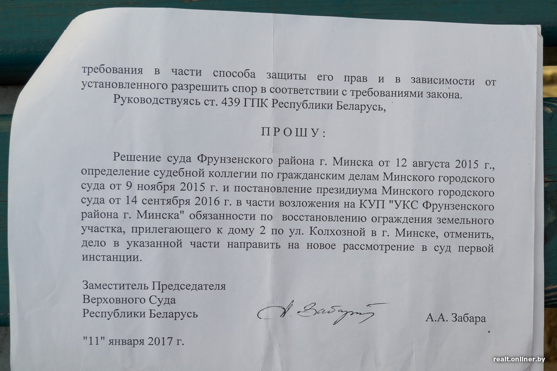Отказ не заставил минчанина остановиться. Вместе с УКСом он прошелся по всем ступеням судебной системы и наконец добрался до Верховного суда. На этот раз ситуацию изучили более пристально. В результате озвученное ранее решение Фрунзенского суда, а также определение судебной коллегии по гражданским делам Минского городского суда и постановление президиума Минского городского суда в части возложения на УКС обязанности по восстановлению ограждения земельного участка было решено отменить. Дело в указанной части направить на новое рассмотрение в суд первой инстанции.