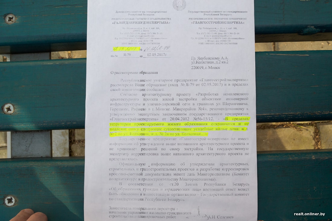 За время судебных препирательств Александр получил на руки много любопытных официальных бумаг. Так, например, в ответе Мингорисполкома от 17 апреля 2014 года говорится, что акт выбора УКСу Фрунзенского района мест размещения земельного участка для разработки комплексного архитектурного проекта жилой застройки в границах улиц Шаранговича — Горецкого — Рафиева надо считать утратившим силу. В ответе за июль 2015 года за подписью заместителя председателя говорится о том, что «в отношении квартиры №2 по улице Колхозной, 2 Мингорисполкомом не принималось решение о предстоящем изъятии земельного участка». Главстройэкспертиза уже в 2017 году отметила, что «в пределах территории проектируемого жилого образования сохраняются и не подлежат сносу следующие усадебные жилые дома: ж. д. №2 по улице Колхозная, ж. д. №2а по улице Колхозная». Остается вопрос — на основании чего УКС полез на землю, которую вообще не должен был трогать?