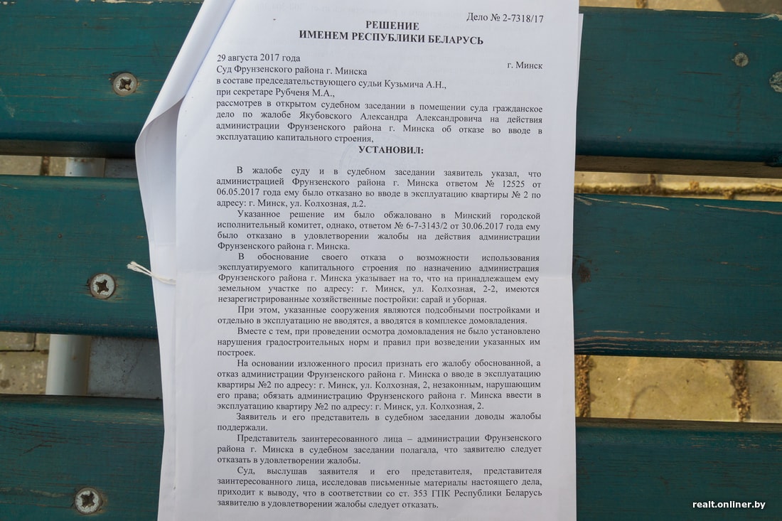 6 мая прошлого года Александр получил от администрации Фрунзенского района очередной отказ о вводе в эксплуатацию квартиры №2. Причина весьма любопытная: на участке находятся незарегистрированные постройки — сарай и уборная. Новое решение со знаком минус было обжаловано мужчиной в Мингорисполкоме, но безрезультатно. Тогда Александр пошел в суд, но и суд Фрунзенского района не увидел оснований удовлетворить просьбу минчанина.