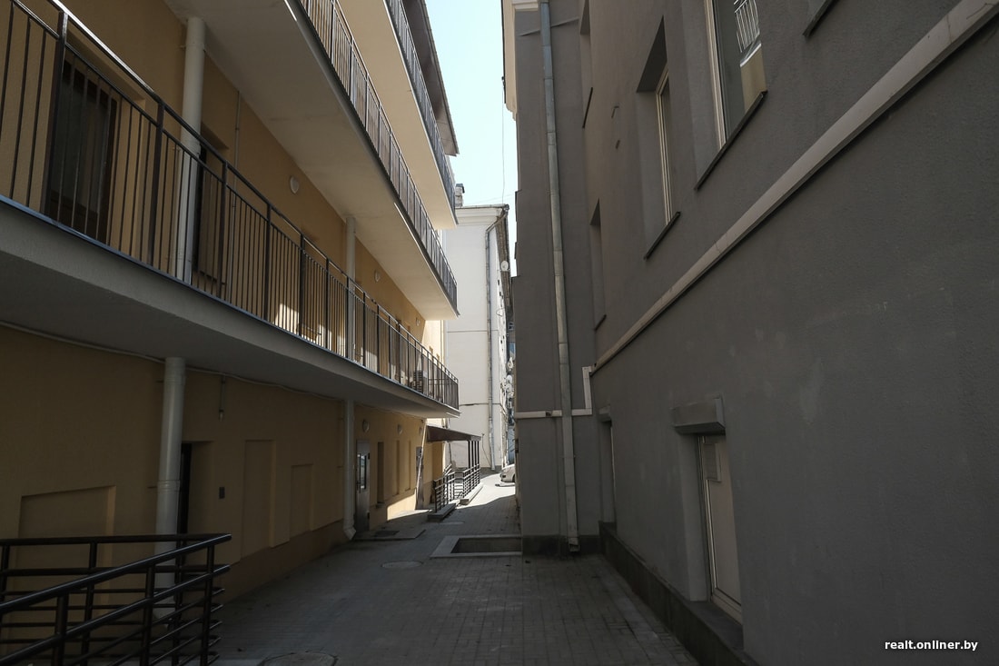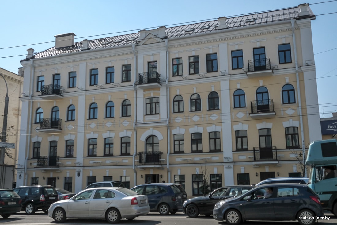 Строительство этого дома началось еще в дореволюционную эпоху. Кирпичное здание имеет нетипичную для Минска планировку. С его тыльной стороны расположены длинные общие балконы, предназначенные для попадания в квартиры.
