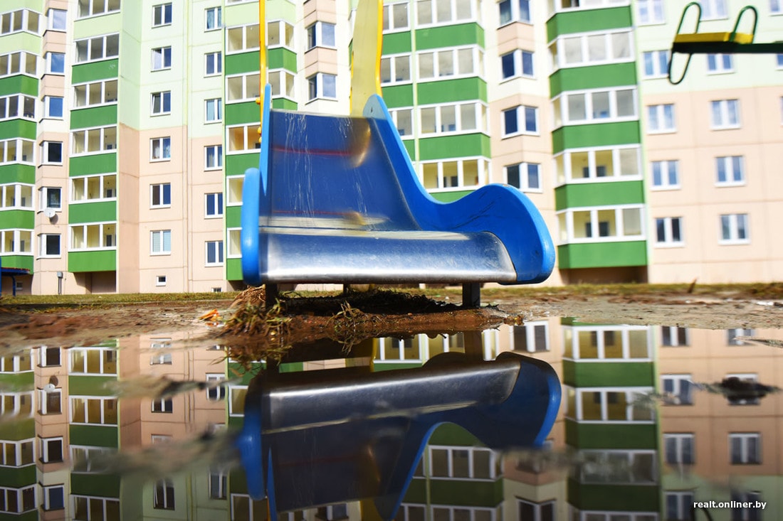 Десятиэтажка на Кулешова, 7, внешне мало отличается от окружающих домов. Просто панелька — но с мемориальным камнем (немного износившимся). Рядом детская площадка с новыми яркими штуками, усыпанная мусором и фекалиями крупных собаководов. Талая вода вроде как должна уйти в дренаж, но не может его найти. В общем, дом как дом.