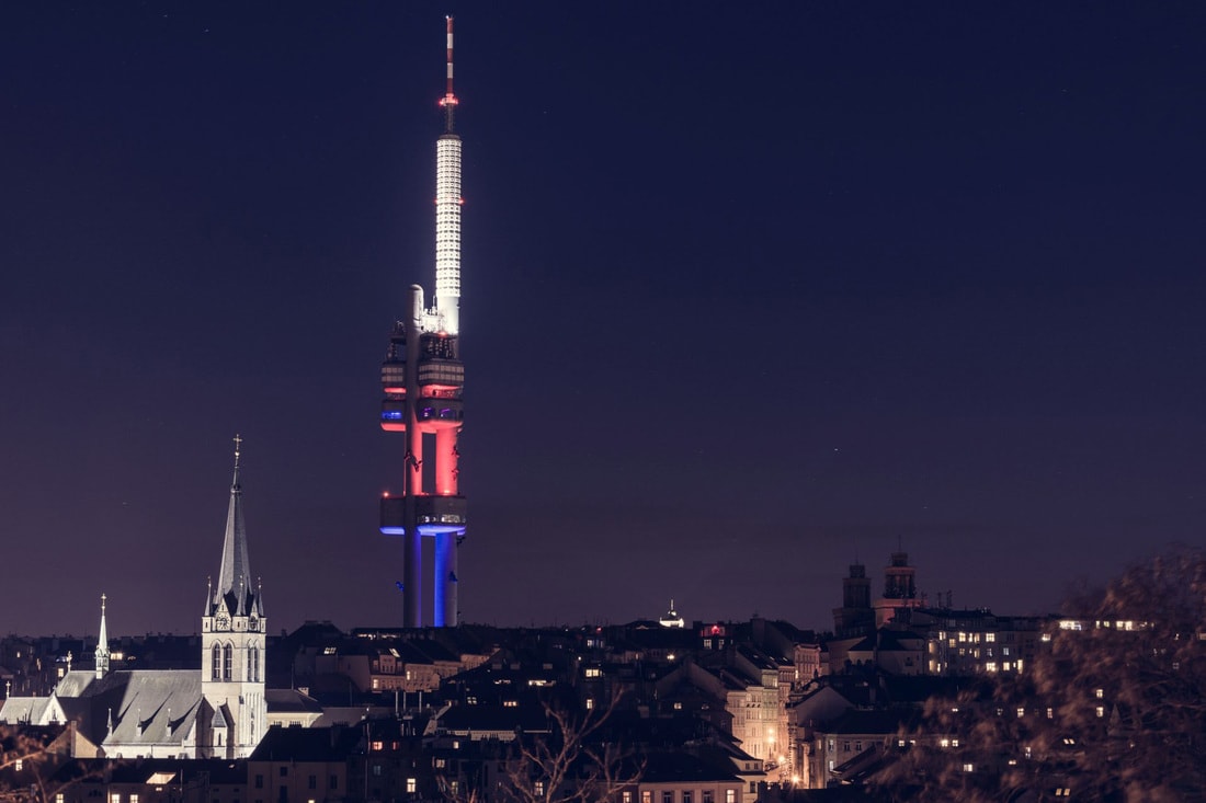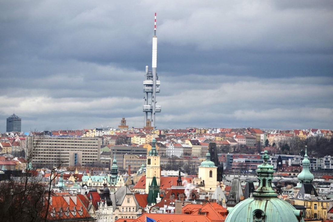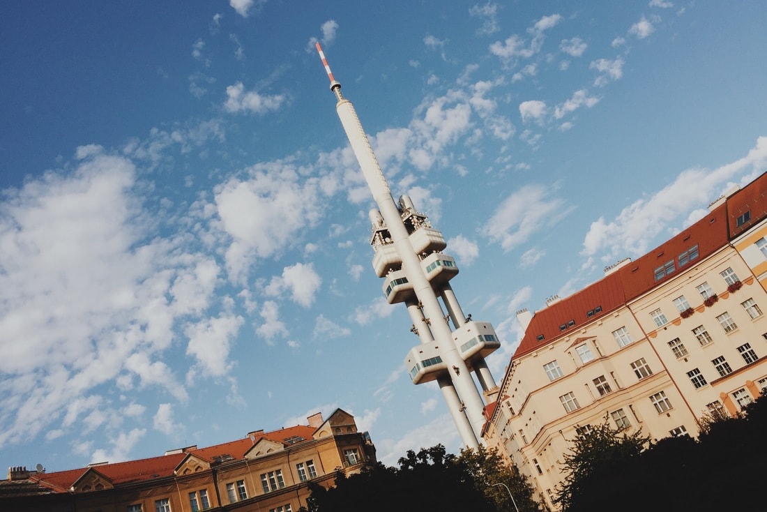 Строительство новой телевизионной башни в чехословацкой столице началось в середине 1980-х годов. Авторы проекта решили отказаться от традиционного вида подобных сооружений в пользу достаточно авангардного решения. Три параллельных бетонных столба соединены на разной высоте перемычками, на которых находятся служебные помещения с оборудованием, ресторан и обзорные площадки. В начале 1990-х объект был закончен и немедленно стал высочайшим сооружением страны (216 метров).