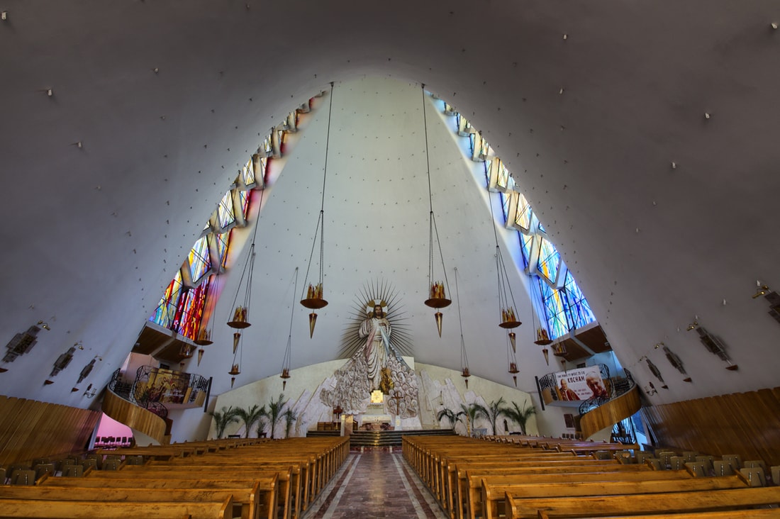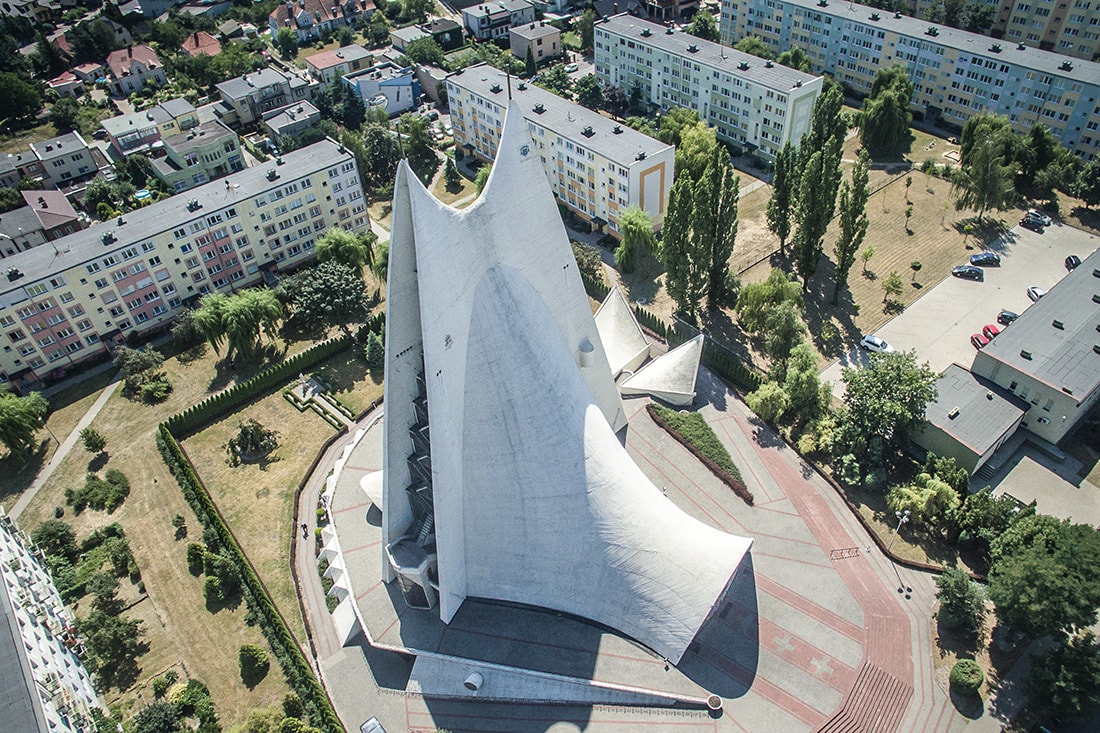 Для примера мы выбрали обычный парафиальный костёл в провинциальном Калише. Это фантастическое сооружение, одновременно отсылающее к традициям католической сакральной архитектуры и подчеркивающее свою исключительную современность использованием гиперболических конструкций. Сложное в инженерном смысле здание строилось целых 12 лет, но результат того стоил, став очередным доказательством тезиса, что и модернизм угоден Богу.