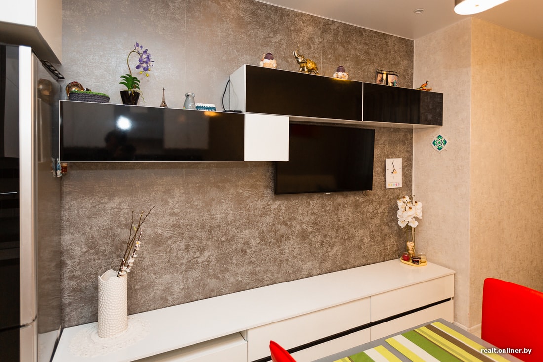 С отделкой стен справились самостоятельно и быстро за счет того, что не снимали гипсокартон и выравнивать стены особо не понадобилось. В гипермаркете удалось найти немецкие и бельгийские обои в детскую и спальню по $5 за трубку, в коридор приобрели в 1,5 раза дороже виниловые украинские обои. В кухню-гостиную решили поискать более изысканный вариант за разумную цену, нашли на «Ждановичах» в остатках четырехметровые немецкие рулоны. Поклеили всю квартиру за неделю.