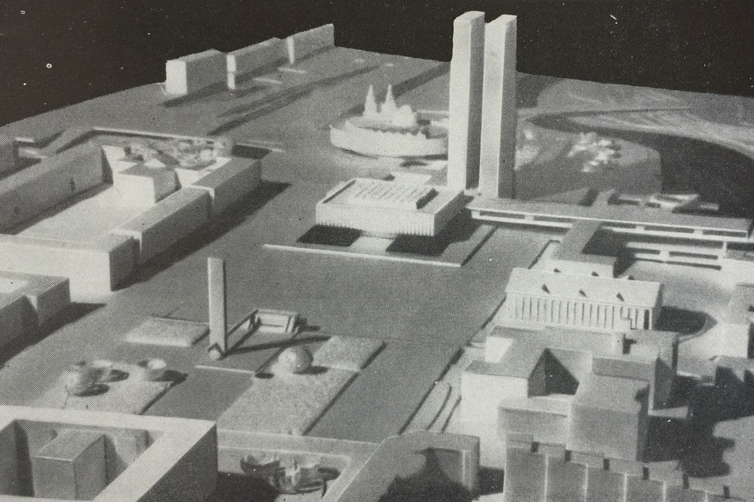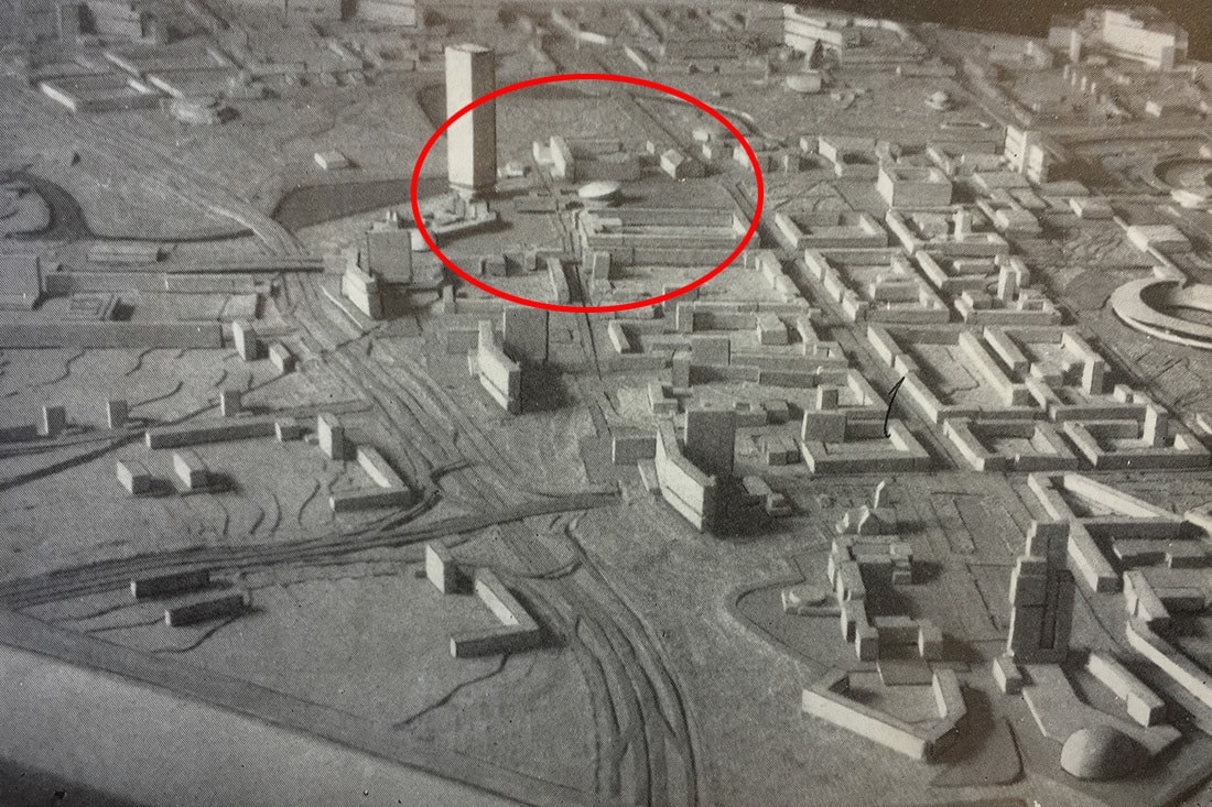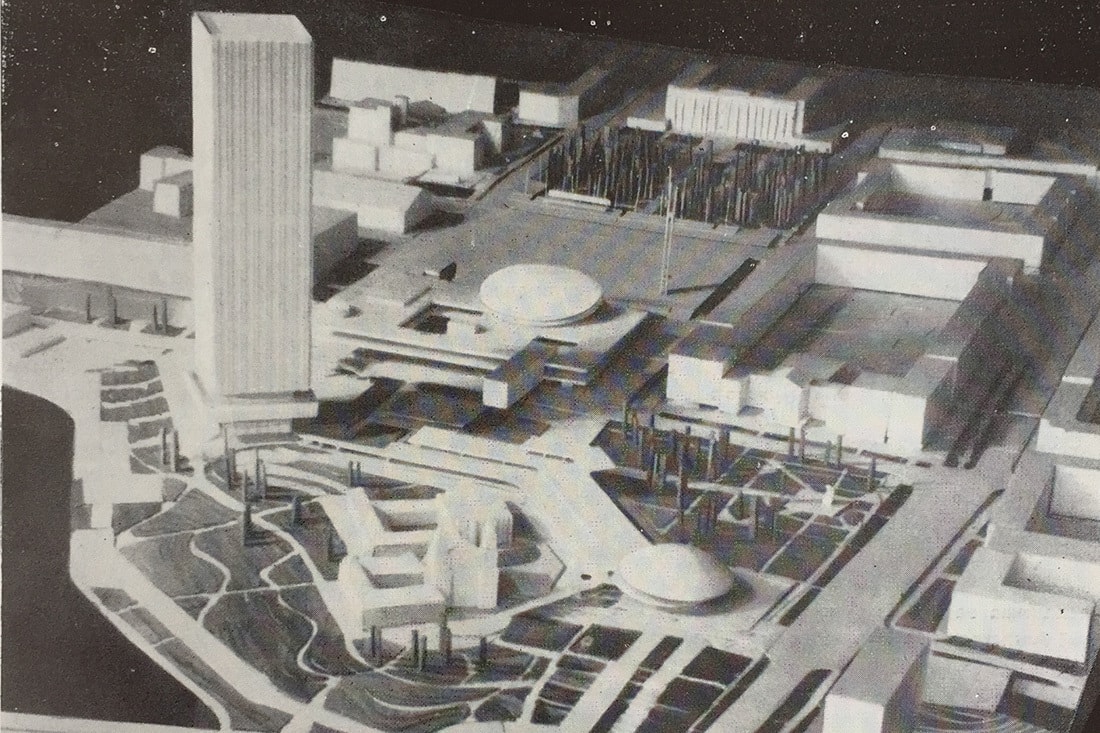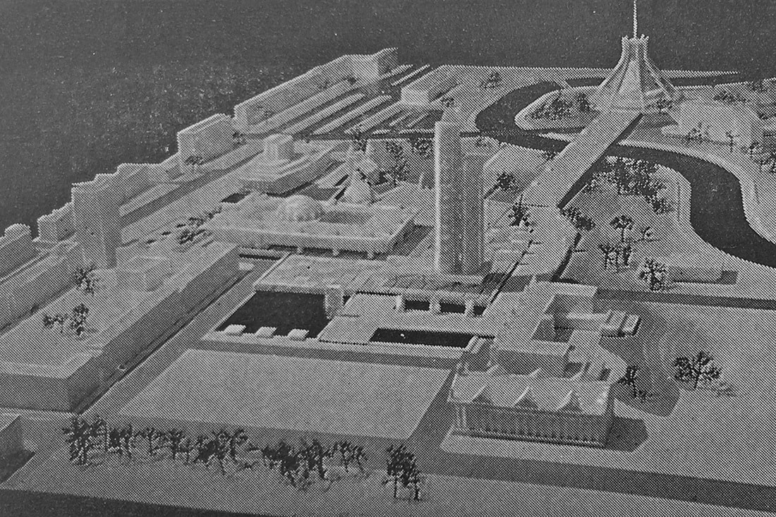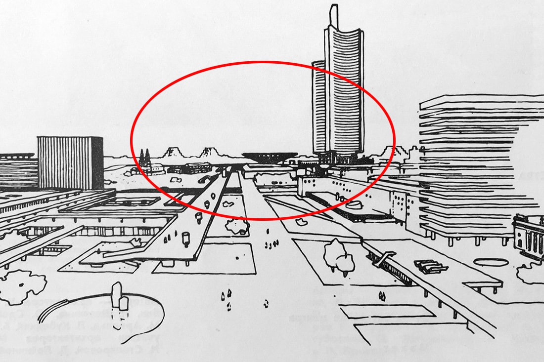 Важнейшей для нашей темы идеей, сформулированной в материалах конкурса 1969 года, было предложение возвести в районе Октябрьской площади и площади Свободы кластера «культурно-просветительских учреждений» с «основным высотным архитектурным акцентом города». То есть вопрос строительства «небоскреба» в этом месте — это вовсе не порождение злого гения современных алчных застройщиков, помноженного на циничные амбиции неразборчивых архитекторов, а давний концепт, предполагавший, что силуэт Минска будет завершен только при наличии мощной вертикали в его самом сердце.