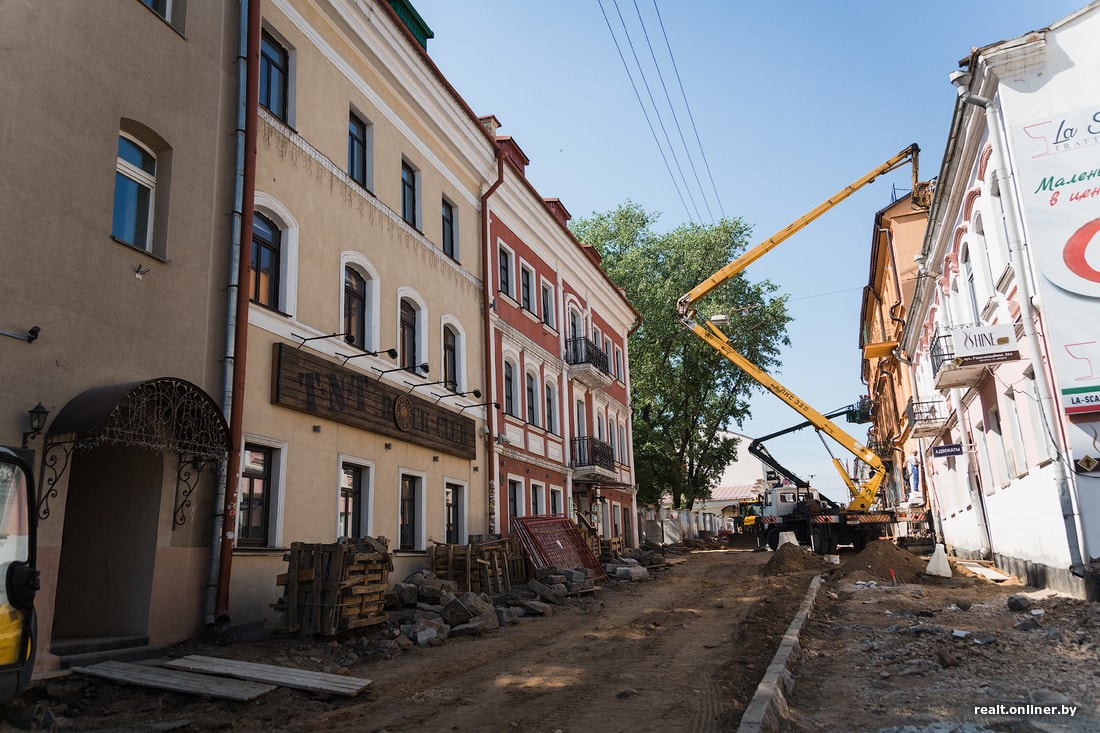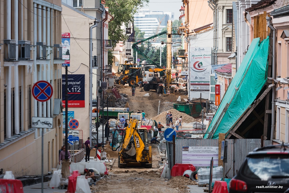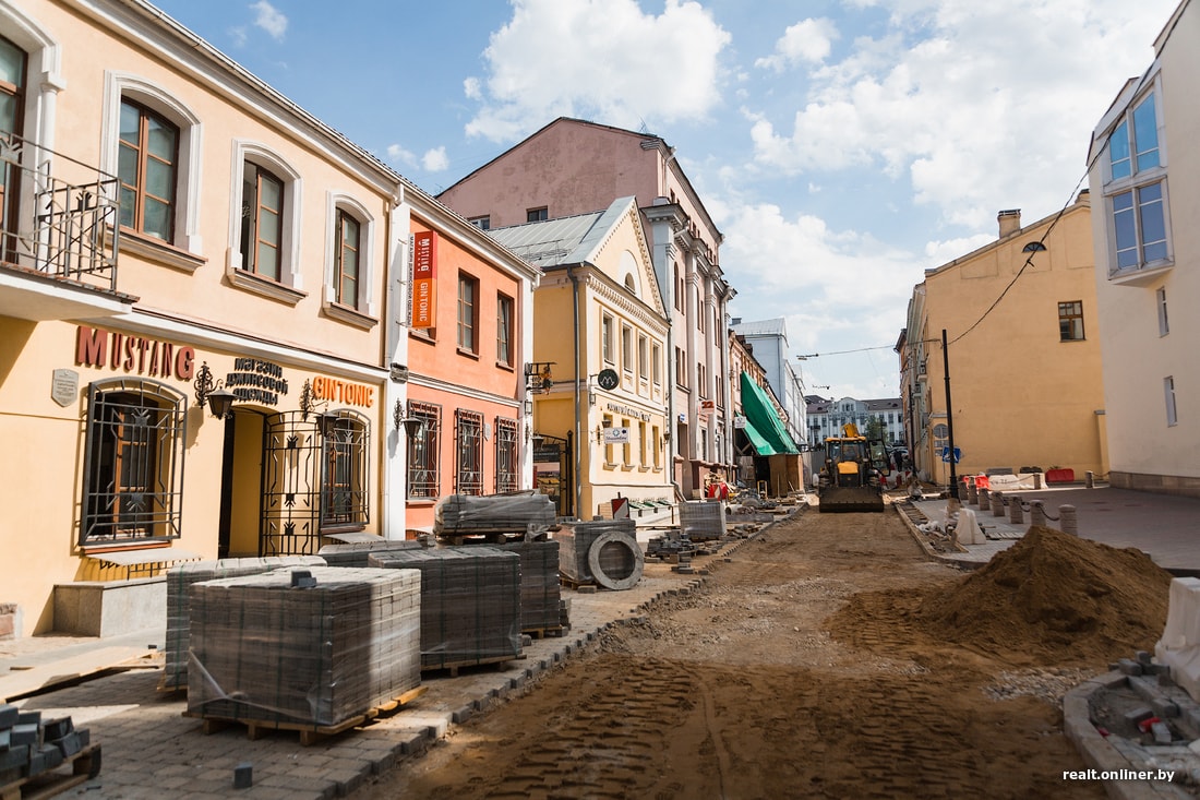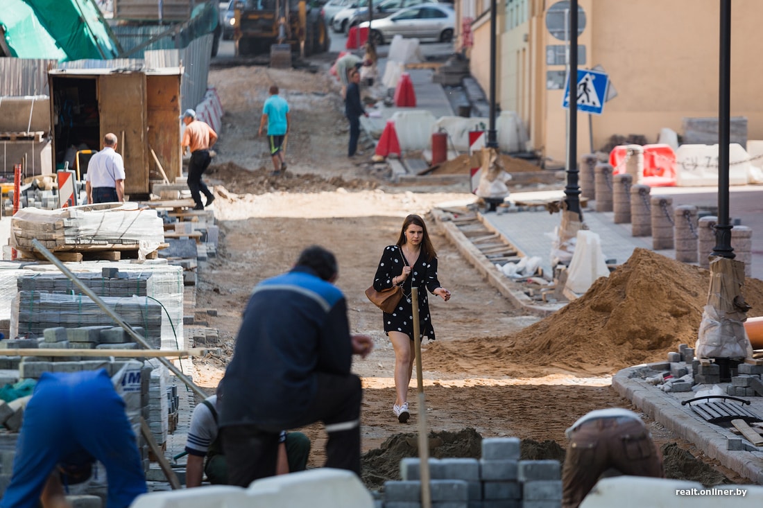 Пешеходный отрезок Комсомольской от улицы Интернациональной до Немиги должен открыться через месяц — в конце июня, сообщало недавно агентство «Минск-Новости». А вот на соседней Революционной улице работы пока далеки от завершения.