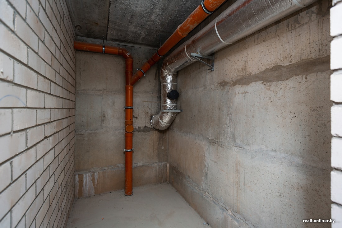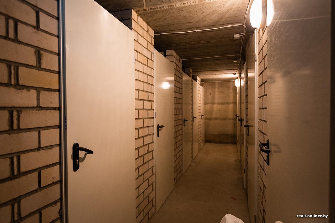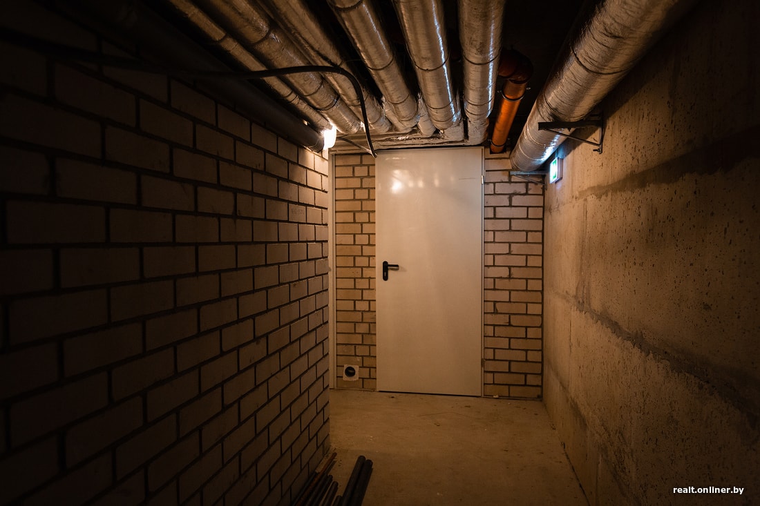 Спускаемся на цокольный этаж, где находятся кладовые комнаты. Эти помещения без отделки покупаются за дополнительную плату и, учитывая небольшие площади квартир, весьма востребованы у жильцов. Можно хранить стройматериалы, шины, велосипед — да что угодно.